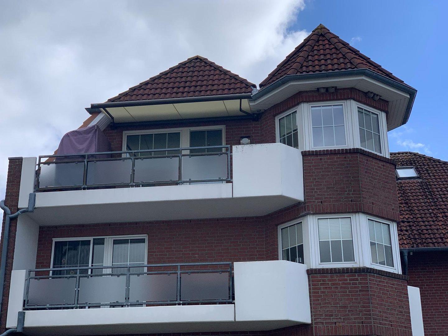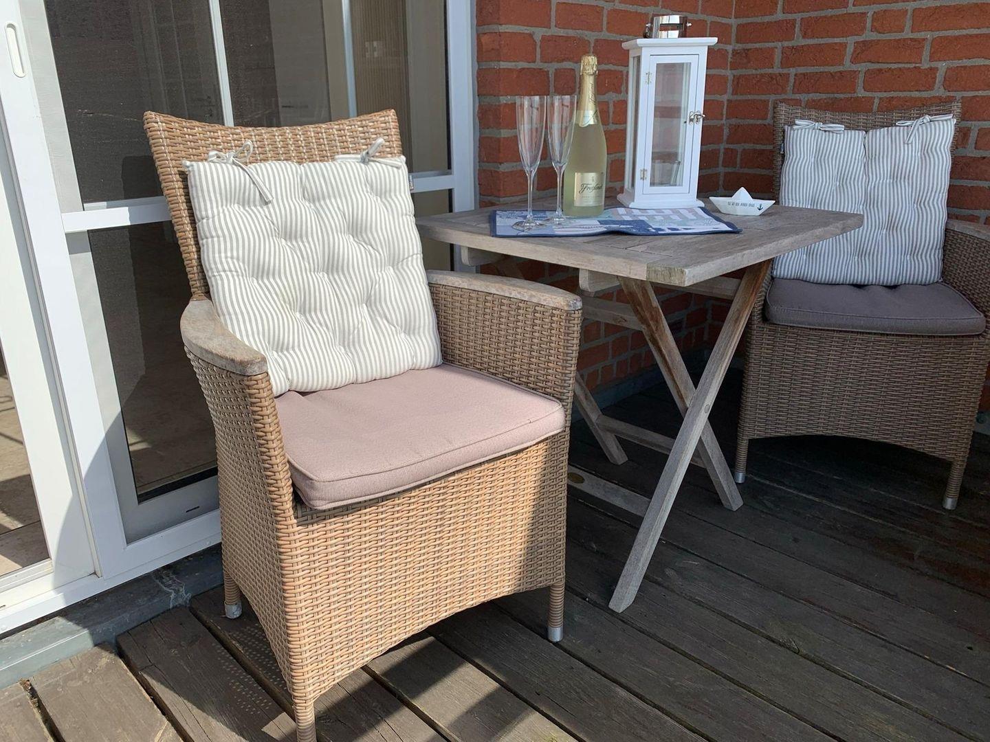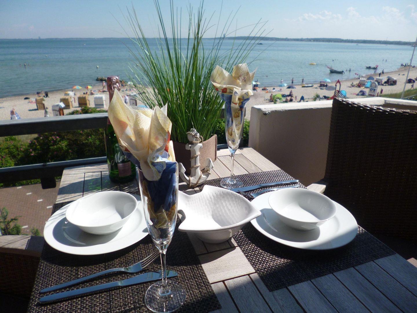 Gleich 2 Balkone bieten Ihnen den bestmöglichen Sonnengenuss. Atmen Sie die Seeluft und genießen Sie den Blick über die Lübecker Bucht mit Sonnenschein vom Vormittag bis zum Nachmittag Richtung Süd-Osten. Danach erleben Sie den Meerblick von der nach Süd-Westen ausgerichteten sonnigen Loggia bis zum Abend. Schöne Balkonmöbel runden Ihr Wohlbefinden ab. Dabei belüften Sie die Räume ohne Angst vor Plagegeistern, denn beide Balkontüren verfügen über einen sehr hochwertigen Insektenschutz mit Pollenfilter.