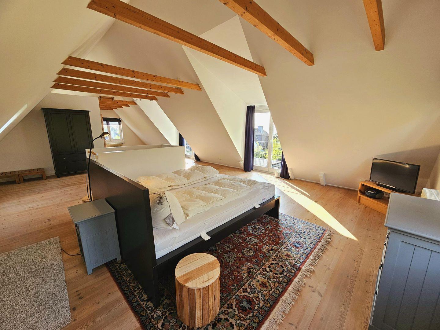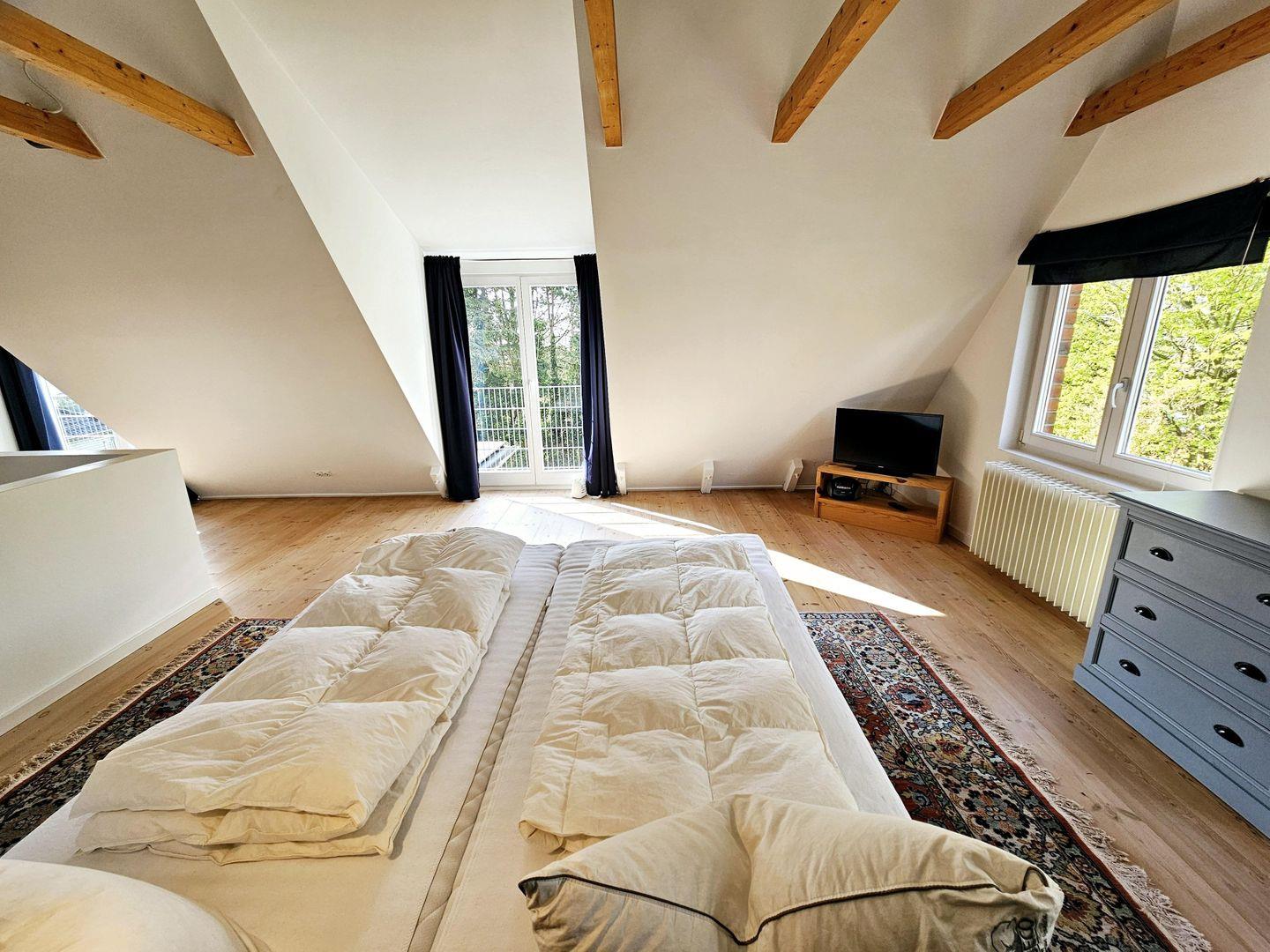 Ein Schlafzimmer im Obergeschoss mit einem Doppelbett (zwei Matratzen 0,90 x 2,00 m). Hier ist ein zweiter Fernseher untergebraucht.