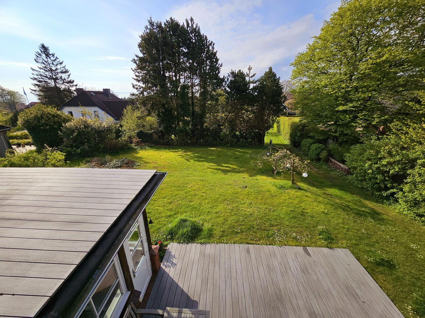 Vom Esszimmer und vom Wohnzimmer aus gelangen sie auf die schöne Holz-Terrasse, die komplett mit Tisch, Stühlen, Bank und Sonnenschirm möbliert ist.