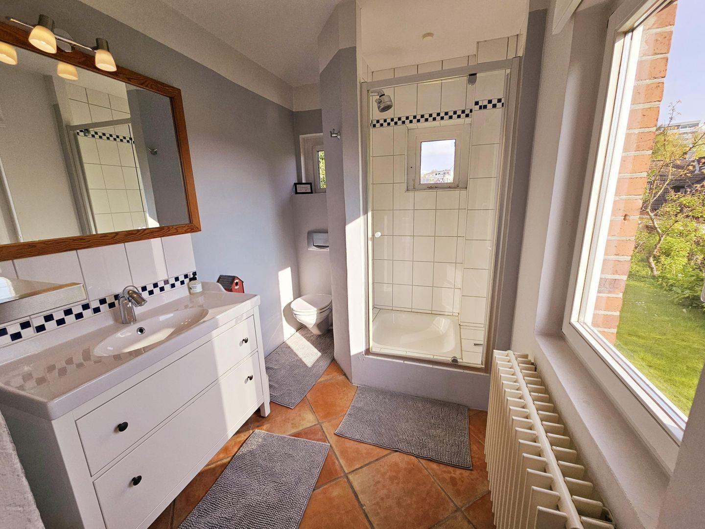 Im Obergeschoss finden Sie ein Badezimmer mit Dusche und Eckbadewanne sowie WC und Waschbecken vor.