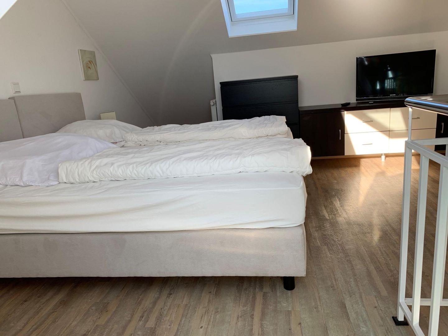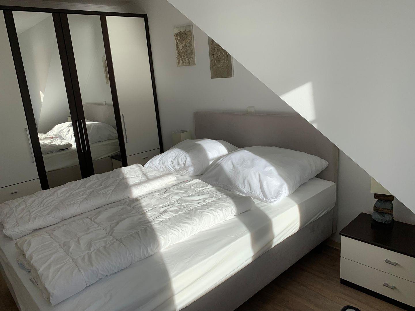Ein Balkon geht vom Wohnzimmer aus, die kleine Dachterrasse erreichen Sie über das zweite offene Schlafzimmer, das Sie über eine Treppe erreichen.