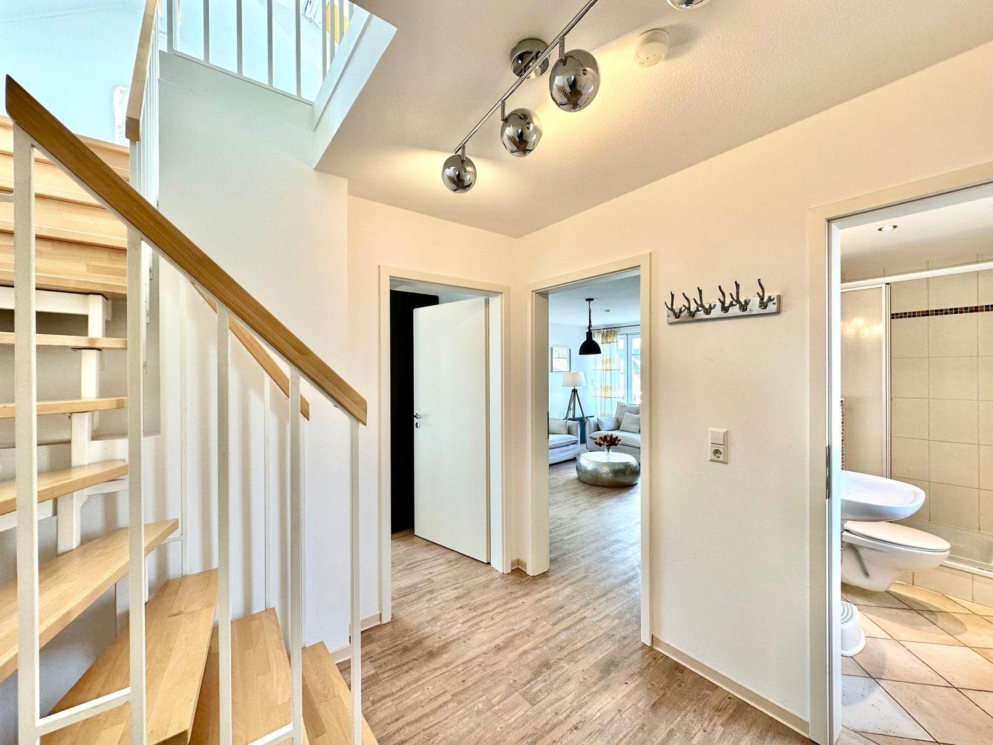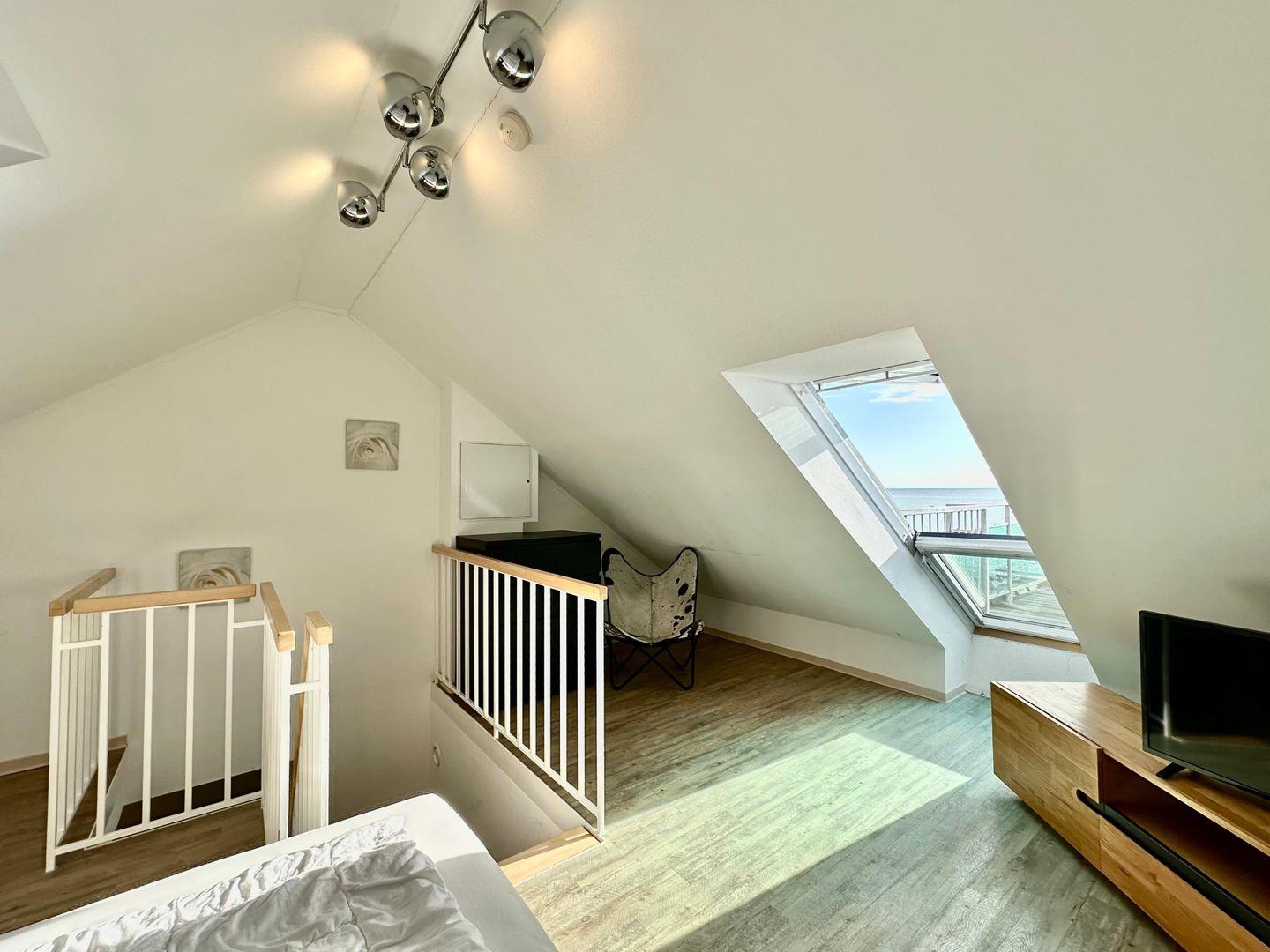 Eine kleine Dachterrasse mit einem tollem Meerblick erreichen Sie über das obere offene Schlafzimmer, welches Sie über eine Treppe erreichen. Der zweite größere Balkon hat einen seitlichen Meerblick. Modernes Duschbad mit Fenster.