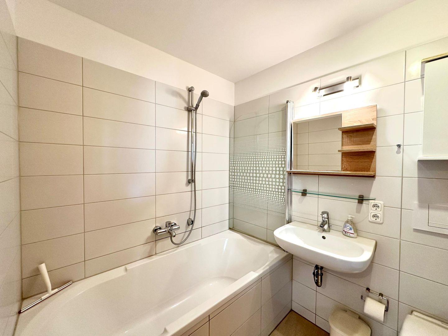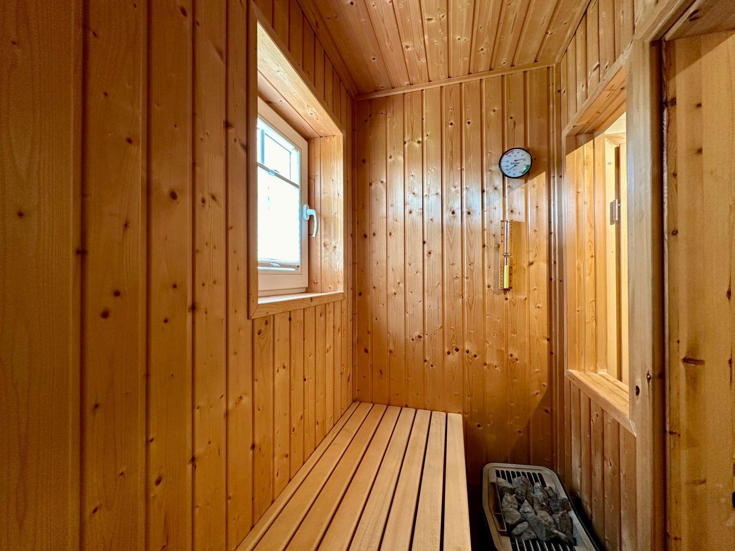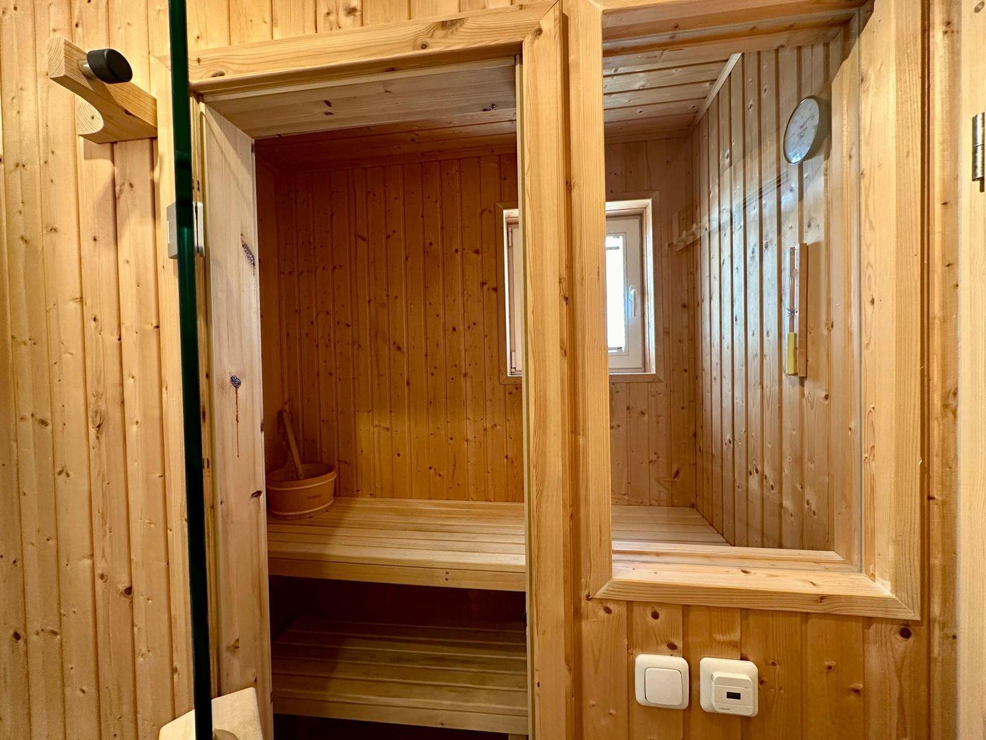 Das moderne Badezimmer bietet durch die Badewanne mit Duschgelegenheit und integrierter Sauna Raum für entspannende Stunden.