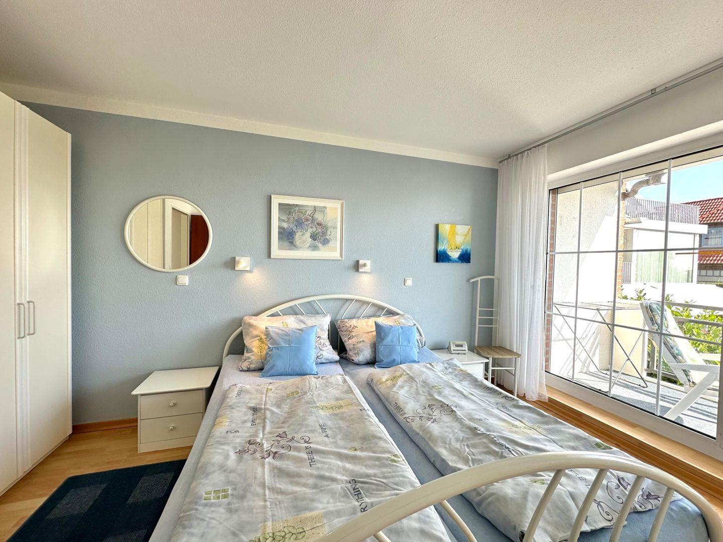 Vom Elternschlafzimmer aus können Sie auf Ihrem 2. Balkon den Sonnenaufgang und ebenso den Blick auf die Ostsee erleben. Es ist ausgestattet mit einem Doppelbett (zwei Matratzen 90 x 200 cm) und einem großen Kleiderschrank. Das Schlafzimmer ist verdunkelbar mit Außenrollläden, so dass Sie auch im Sommer erholsam ausschlafen können. Ein zweiter SAT-TV hängt hier an der Wand. Der Fernseher ist vorprogrammiert für SAT HD + und SAT SKY, sofern Sie ihre entsprechenden Karten SAT HD+ und/oder SAT SKY mitbringen. Sie haben somit einen Fernseher im Elternschlafzimmer und einen im Wohnzimmer zur Verfügung.