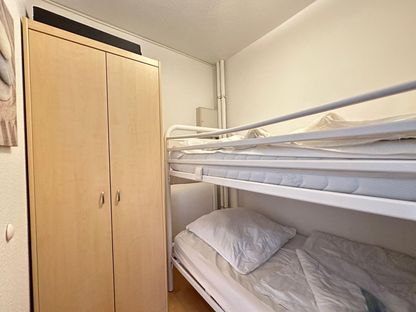 Das Kinderschlafzimmer ist innenliegend und verfügt über ein Etagenbett und einen Kleiderschrank.