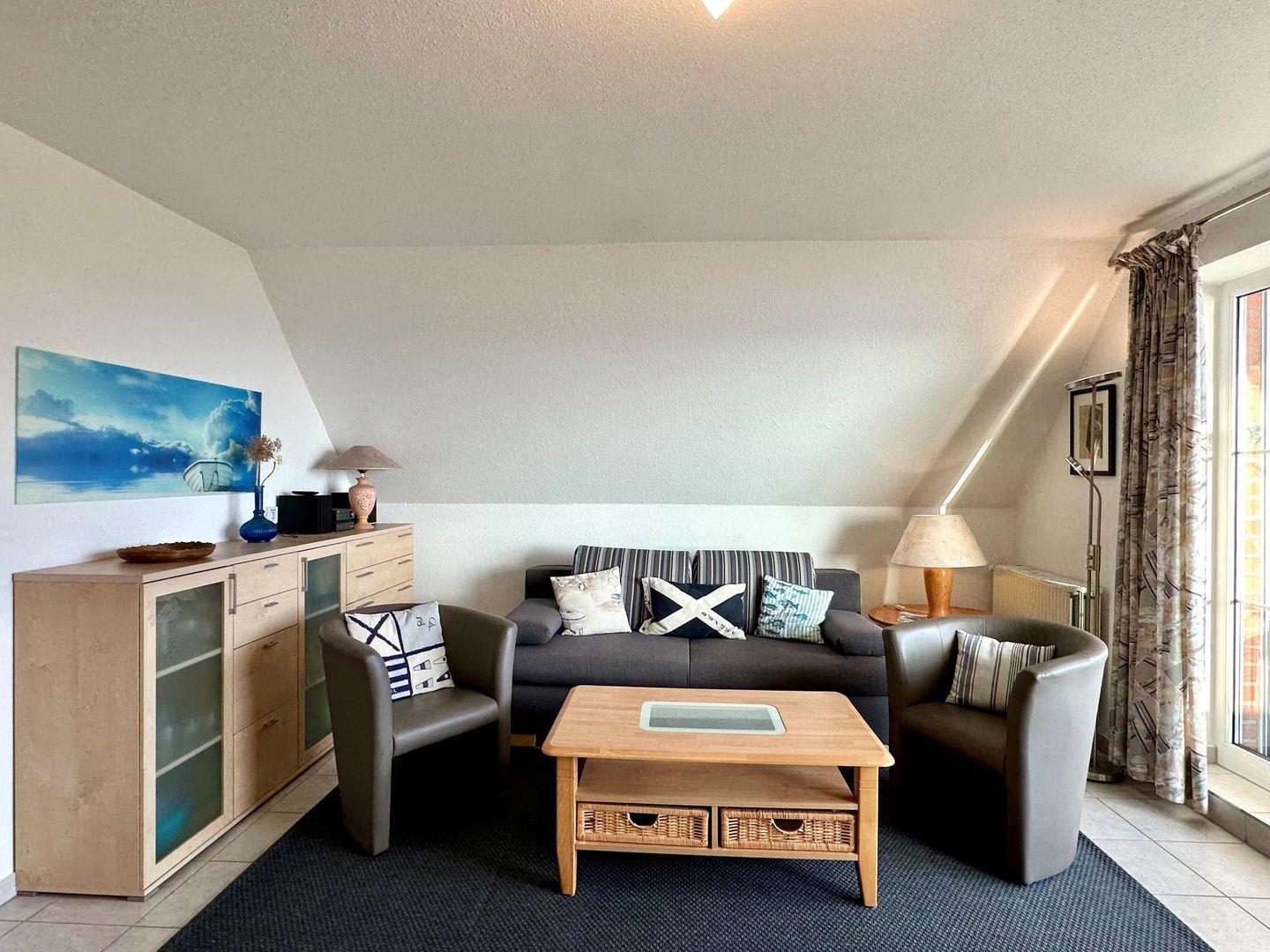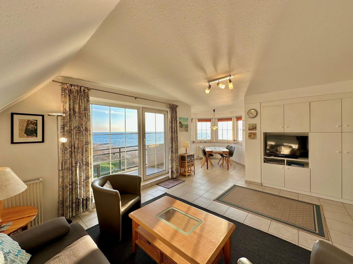 Die Wohnung ist 49 m² groß und befindet im zweiten Stock. Sie verfügt über einen großen Balkon, von dem Sie wunderbar den Sonnenaufgang mit einer Tasse Kaffee beobachten können. Nicht nur von dort haben Sie einen einzigartigen Blick aufs Meer, sondern auch aus dem Erker. Hier können Sie bis zur Hafeneinfahrt nach Travemünde schauen,
