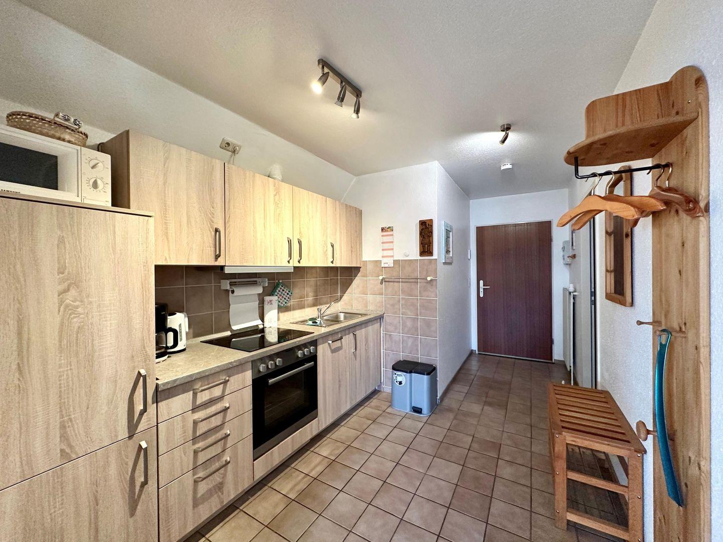 Die weitere Aufteilung der Wohnung: Bad mit Dusche, voll ausgestattete Küche, kleiner Flur mit Garderobe.