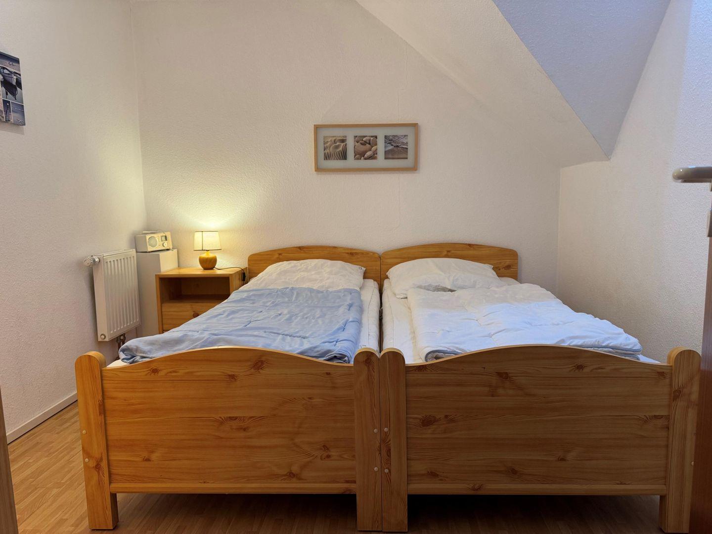 Das Schlafzimmer verfügt über zwei Einzelbetten (diese können zusammengestellt werden) und einen geräumigen Kleiderschrank.