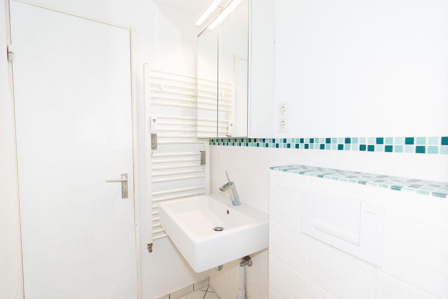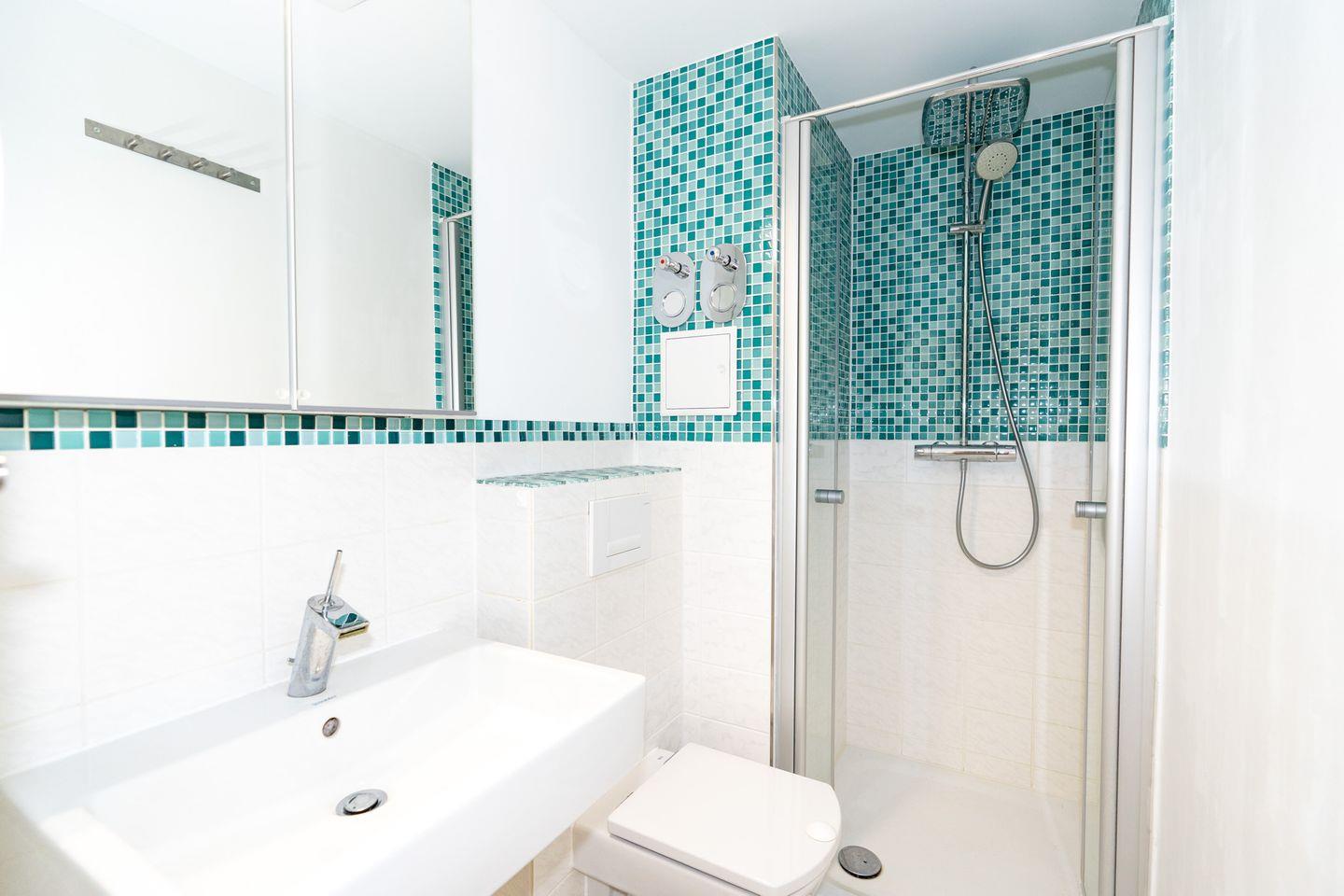 Das Badezimmer verfügt über ein modernes Waschbecken, Spiegel und einer Dusche. Für längere Aufenthalte stehen Ihnen zudem gemeinschaftlich nutzbare Waschmaschine und Trockner zur Verfügung.