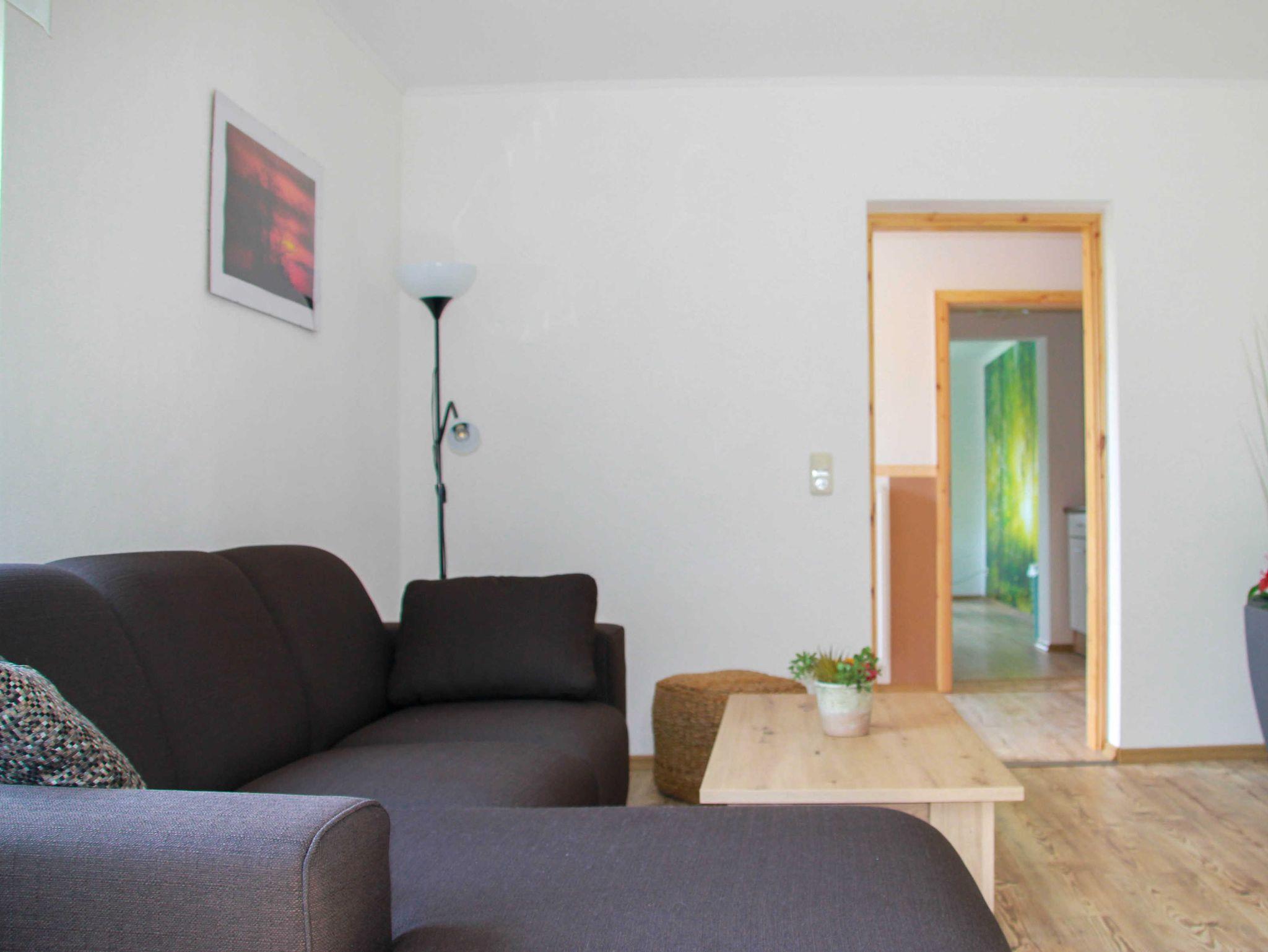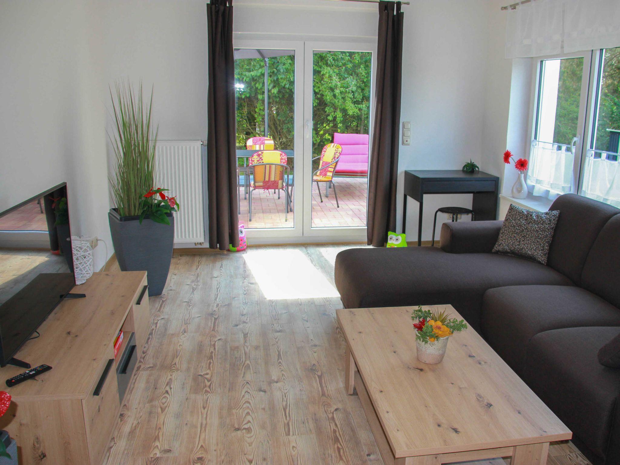 Eine gemütliche Sofaecke mit Tisch und TV Gerät ist der Mittelpunkt des modern ausgestatteten Wohnzimmers