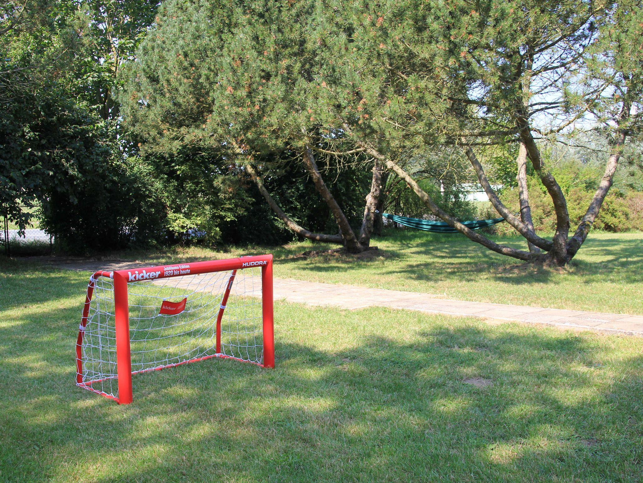 Der Garten mit einer großen Rasenfläche lädt zu einem Federballspiel mit den Kindern ein.