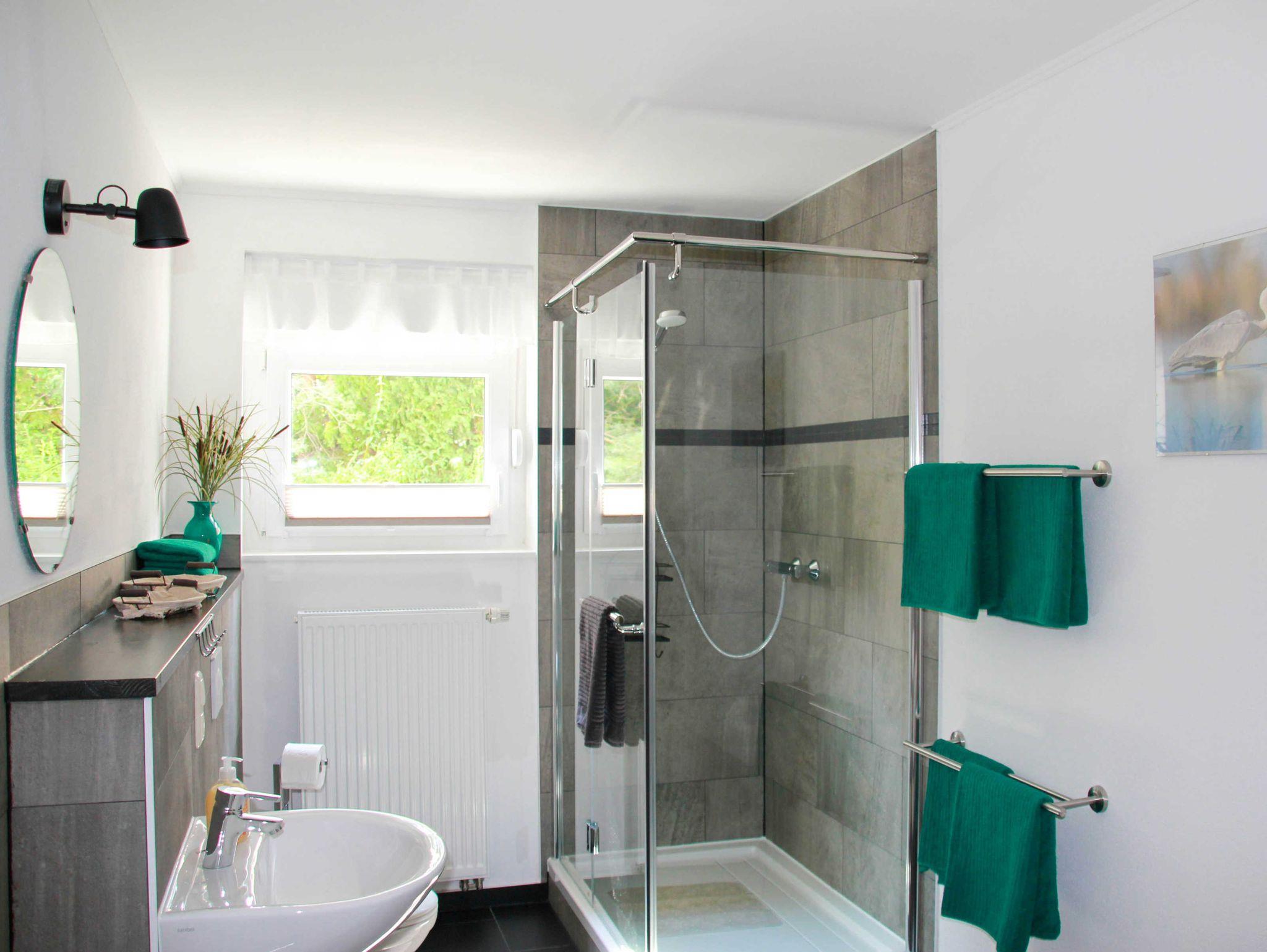 Im Großen Badezimmer befindet sich eine Badewanne, eine Dusche, ein WC und ein Waschbecken.