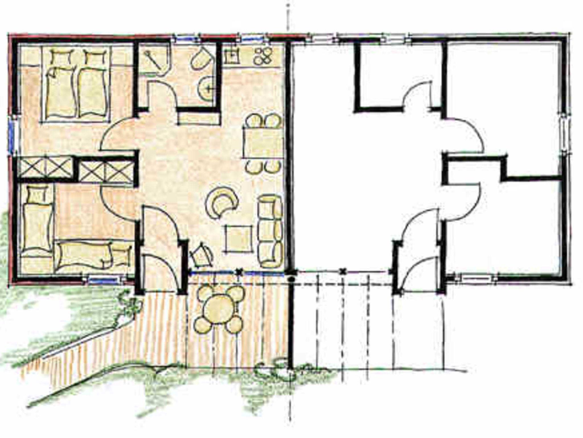 Der Bungalow bietet bis zu 4 Personen Platz und verfügt über zwei Schlafräume (1x Doppelbett und 1x zwei Einzelbetten), ein Wohnraum mit offener Küchenzeile sowie einem Bad mit Waschtisch, Dusche und WC. Die Waschmaschine und der Trockner befinden sich im Wirtschaftshaus und werden für alle Gäste der Anlage gegen Gebühr bereitgestellt. Das Mitbringen von Haustieren ist unbedingt vorab mit dem Vermieter abzustimmen und es fallen Gebühren an. Bei den ausgewiesenen Bildern handelt es sich um Wohnbeispiele.