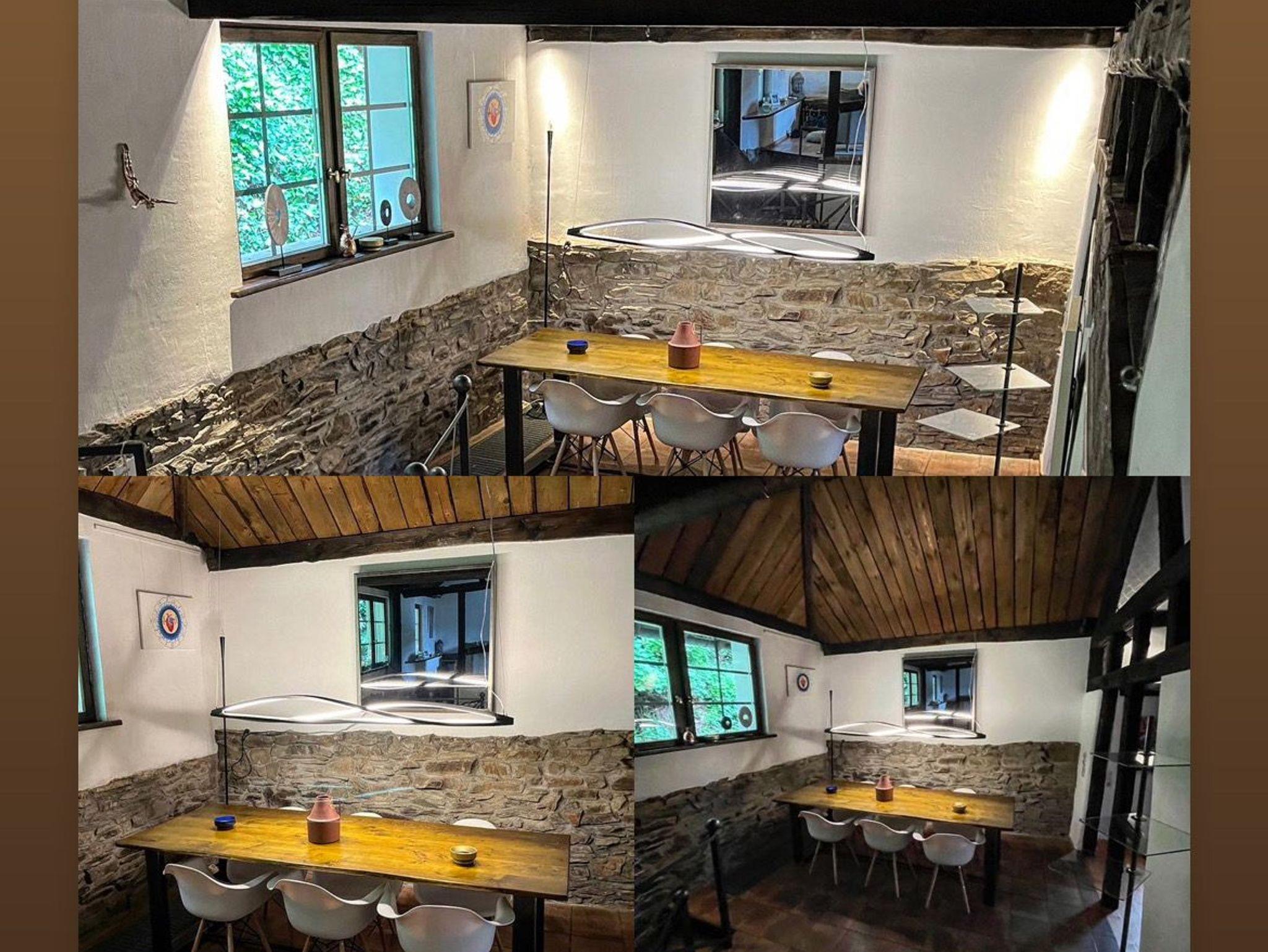 Die ehemalige Scheune ist zur Wohnhalle umgebaut. Sie bietet Ihnen verschiedene Nutzungsoptionen. Der große Esstisch bietet mit seiner Holzplatte bis zu 8 Personen Platz. Vor dem Kaminofen lädt eine Ecklounge zum Verweilen ein. Vom Wohnzimmerbereich kann man den Blick auf den Rursee, den Garten und die Wohnhalle genießen. Ein LED-Flachbildschirm-TV ist natürlich vorhanden.