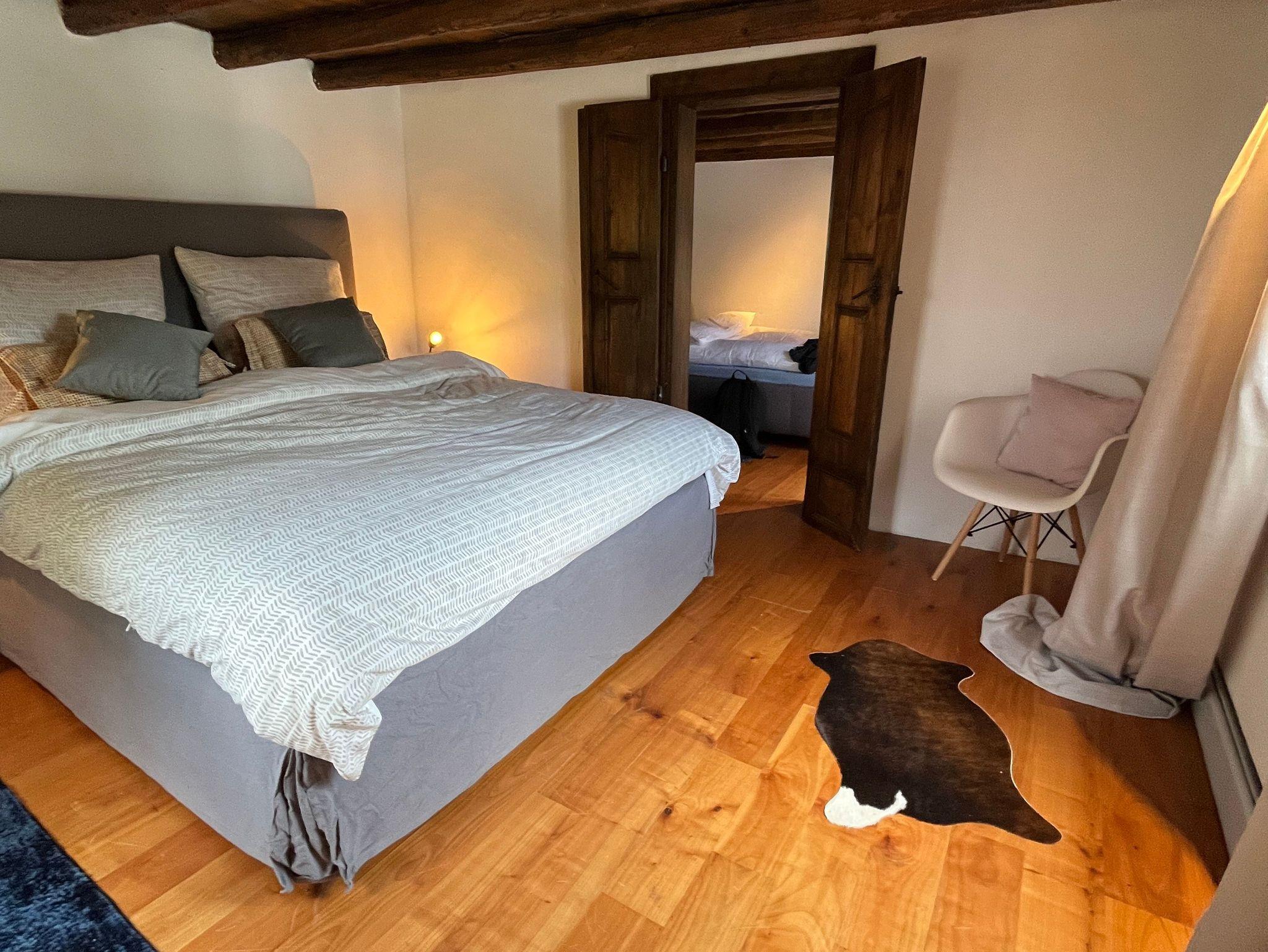 Über die Steintreppe erreichen Sie in der ersten Etage die große Wohnhalle - diese eröffnet mit der bis in Giebel offen Baustruktur ein einmaliges Wohngefühl. Auf dieser Etage liegen auch das Lesezimmer, das 2. Badezimmer und 2 Schlafzimmer. Das zweite Schlafzimmer betritt man über eine historische, doppelflügelige Tür durch das erste Schlafzimmer