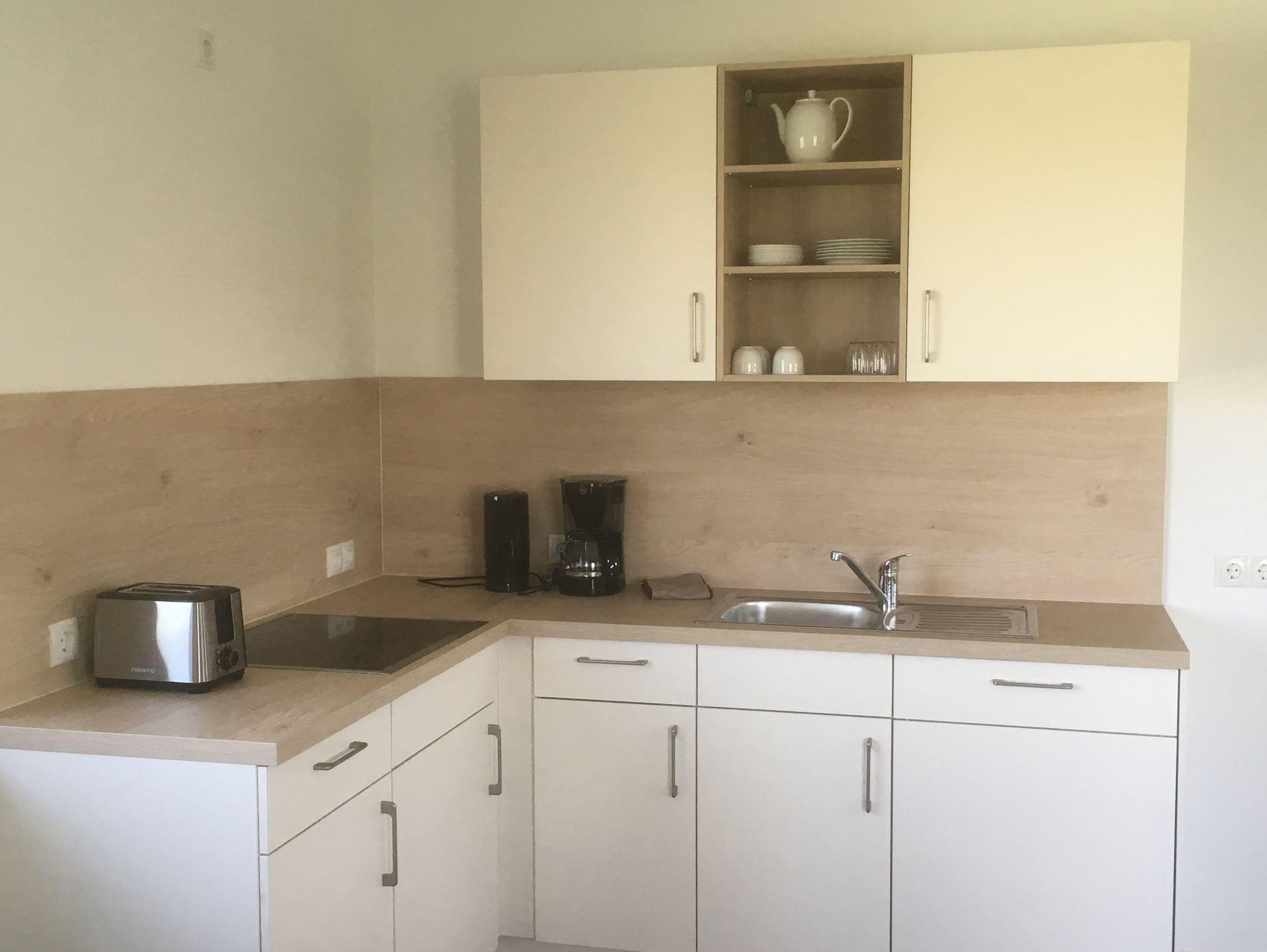 Die Wohnung verfügt über ein Schlafzimmer mit großem Doppelbett(1,80x2,00m), einem Wohn-/Schlafzimmer mit Schlafsofa, TV und Sitzgruppe. Die vollausgestattete Küchenzeile mit Herd, Kühlschrank mit Gefrierfach, Minibackofen, Spülmaschine, Toaster, Kaffeemaschine und Wasserkocher bietet alle wichtigen Küchenutensillien. Ein Esstisch mit vier Stühlen lädt zum gemütlichen Essen ein. Das große Badezimmer mit Fenster und ebenerdiger gefliester Dusche ist für Rollstuhlfahrer geeignet.