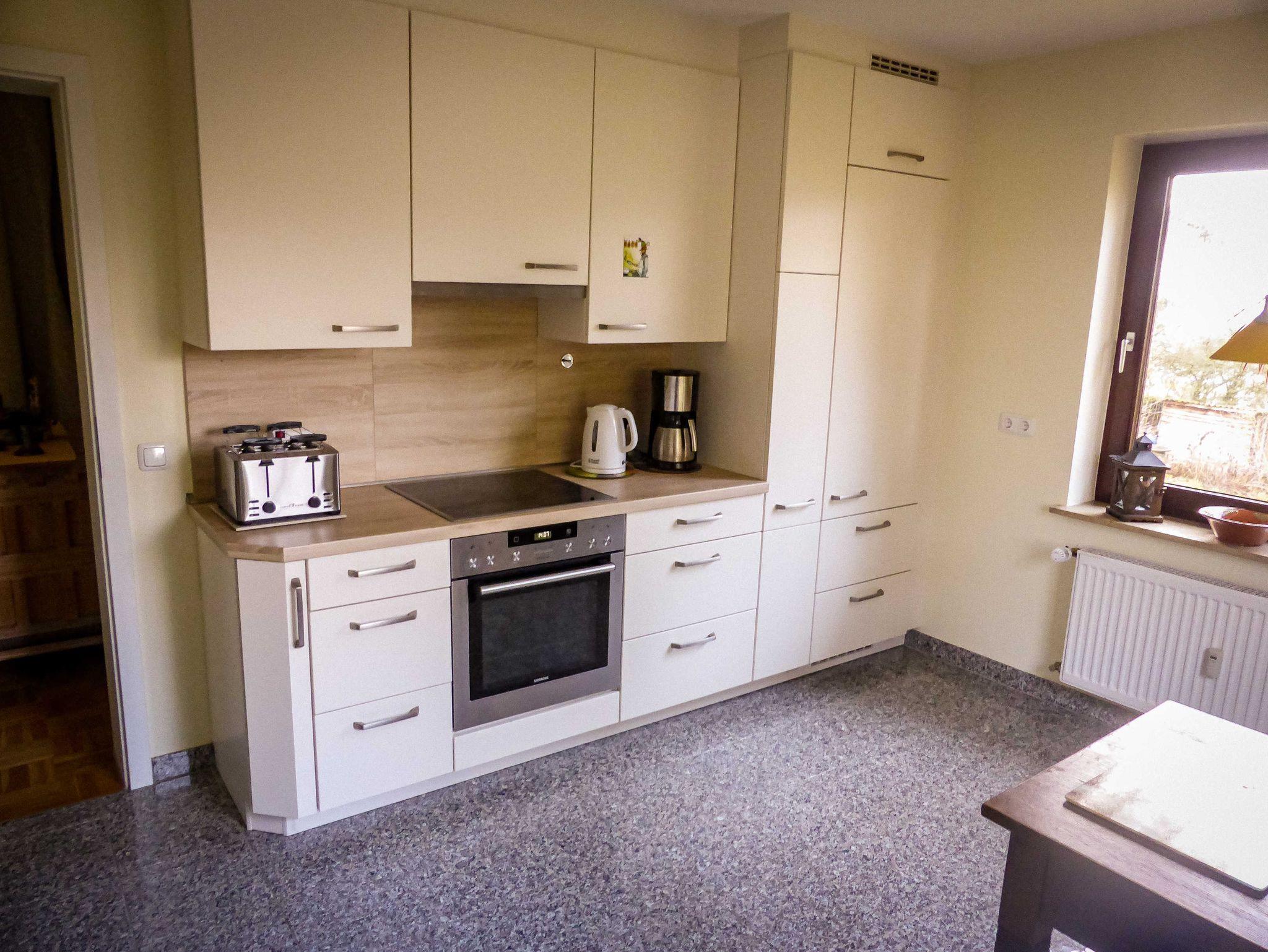 Die Küche verfügt über einen Ceranherd mit Backofen, Kühlschrank, Geschirrspüler, Mikrowelle, Kaffeemaschine, Wasserkocher, einen Toaster und ein kleiner Esstisch mit 4 Sitzmöglichkeiten.