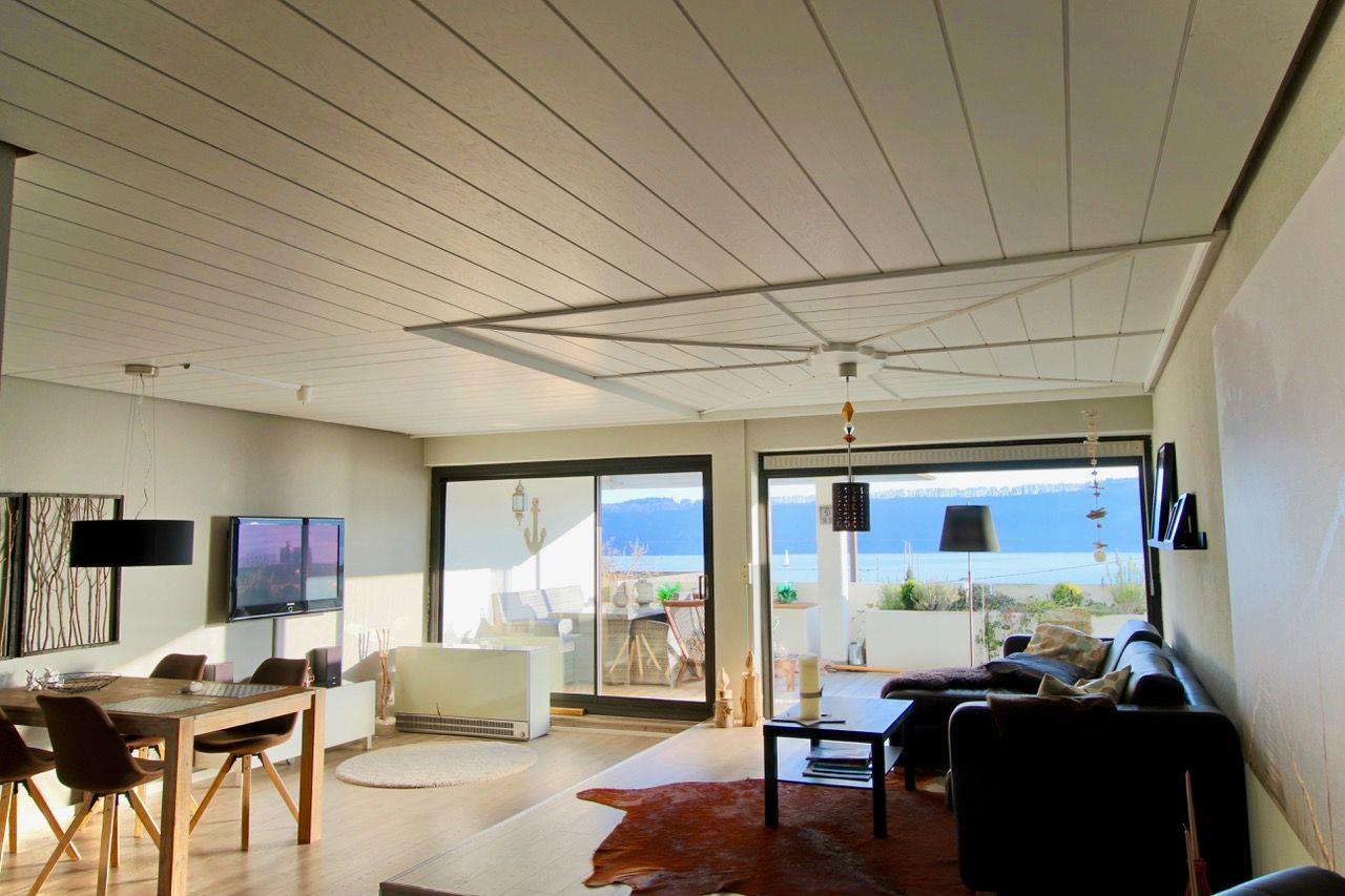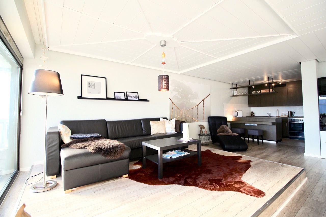 Der lichtdurchflutete Wohnbereich besticht durch eine großzügige Fensterfront, die den Blick auf den See auch im Inneren erlebbar macht. Die moderne Einrichtung mit Holz-Akzenten schafft eine warme und einladende Atmosphäre. Hier finden Sie eine komfortable Wohnlandschaft mit Schlaffunktion, einen Flachbildfernseher und eine Essgruppe für bis zu vier Personen. Eine Relaxliege lädt zum Verweilen ein, während die offene Küche mit einem Küchentresen alle Annehmlichkeiten für die Zubereitung köstlicher Mahlzeiten bietet. Die Küche ist voll ausgestattet und lässt keine Wünsche offen.