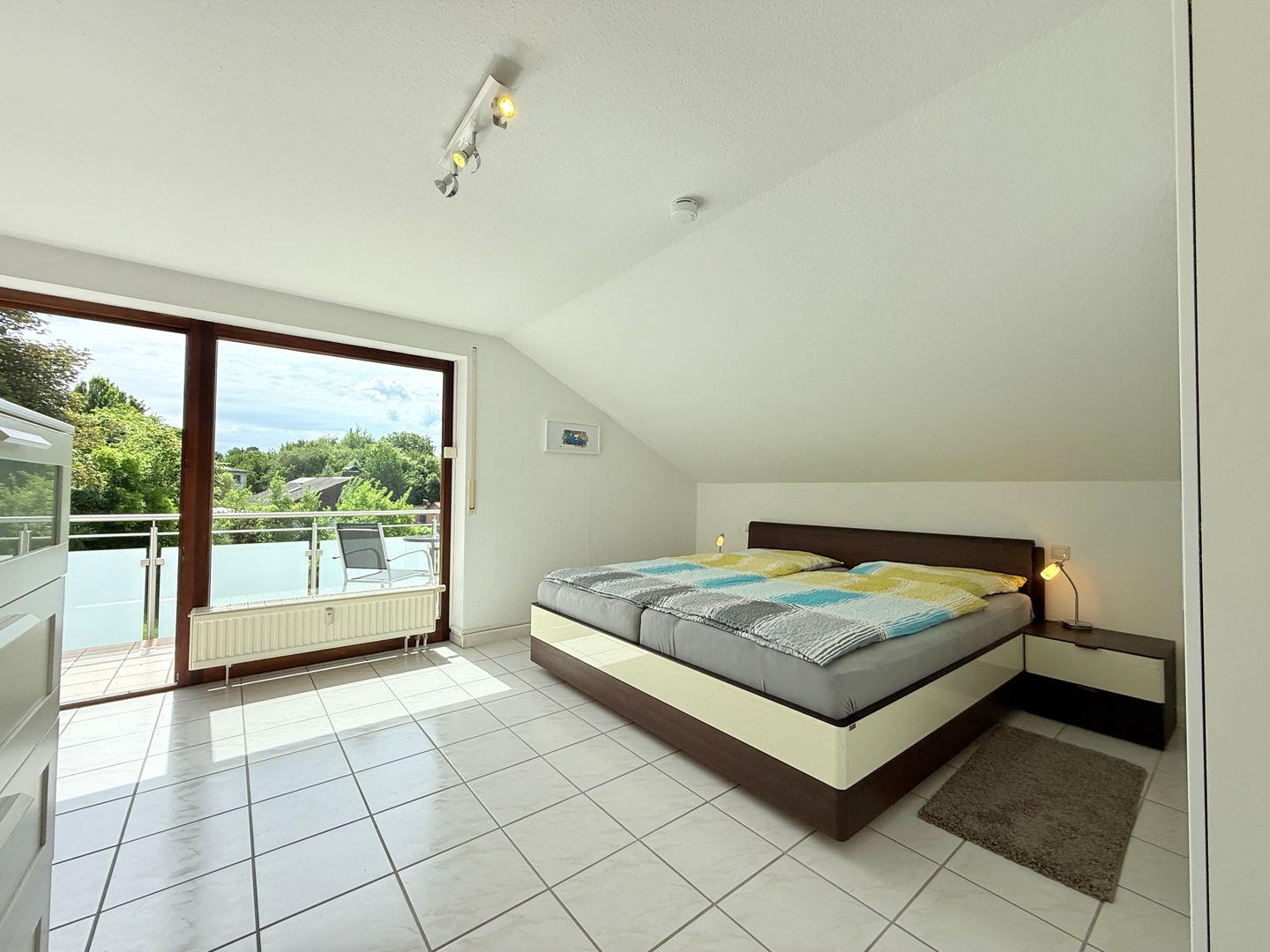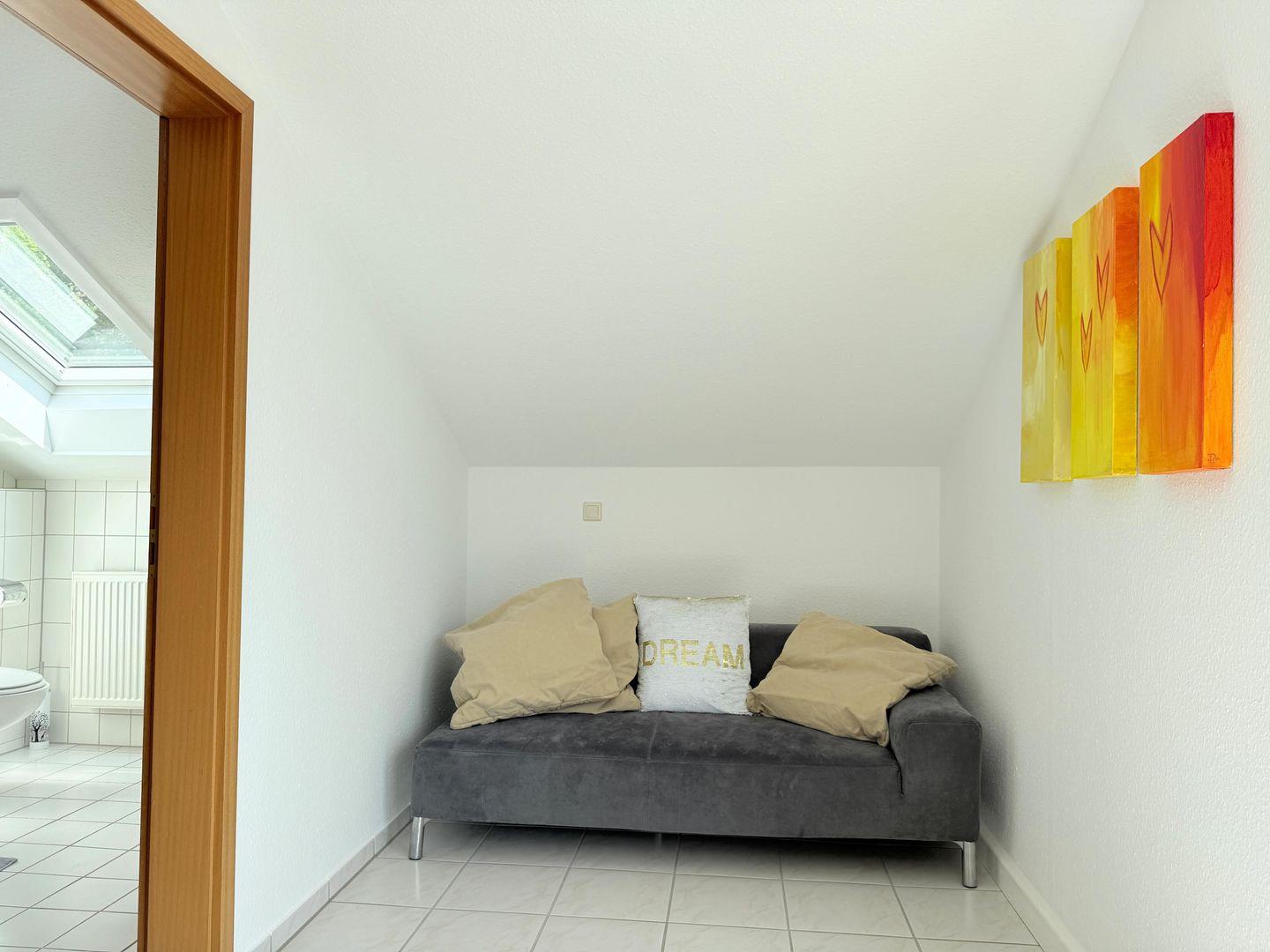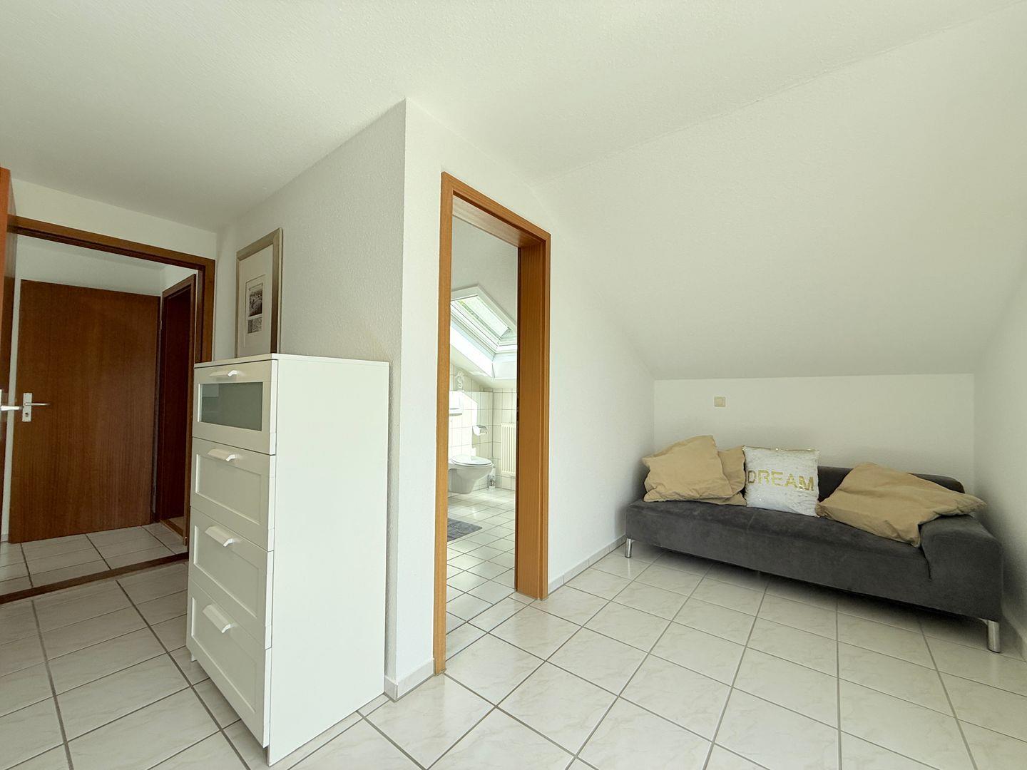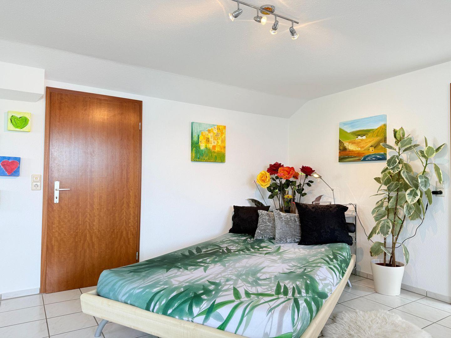 Das Schlafzimmer ist eine Oase der Ruhe und verfügt über einen Fliesenboden sowie reichlich Stauraum in der Kommode und Garderobe. Das geräumige Badezimmer ist mit einer Dusche, einem WC und einem Waschbecken ausgestattet und bietet alles, was Sie für Ihre persönliche Pflege benötigen. Hier genießen Sie dank der großen Fenster viel Tageslicht.