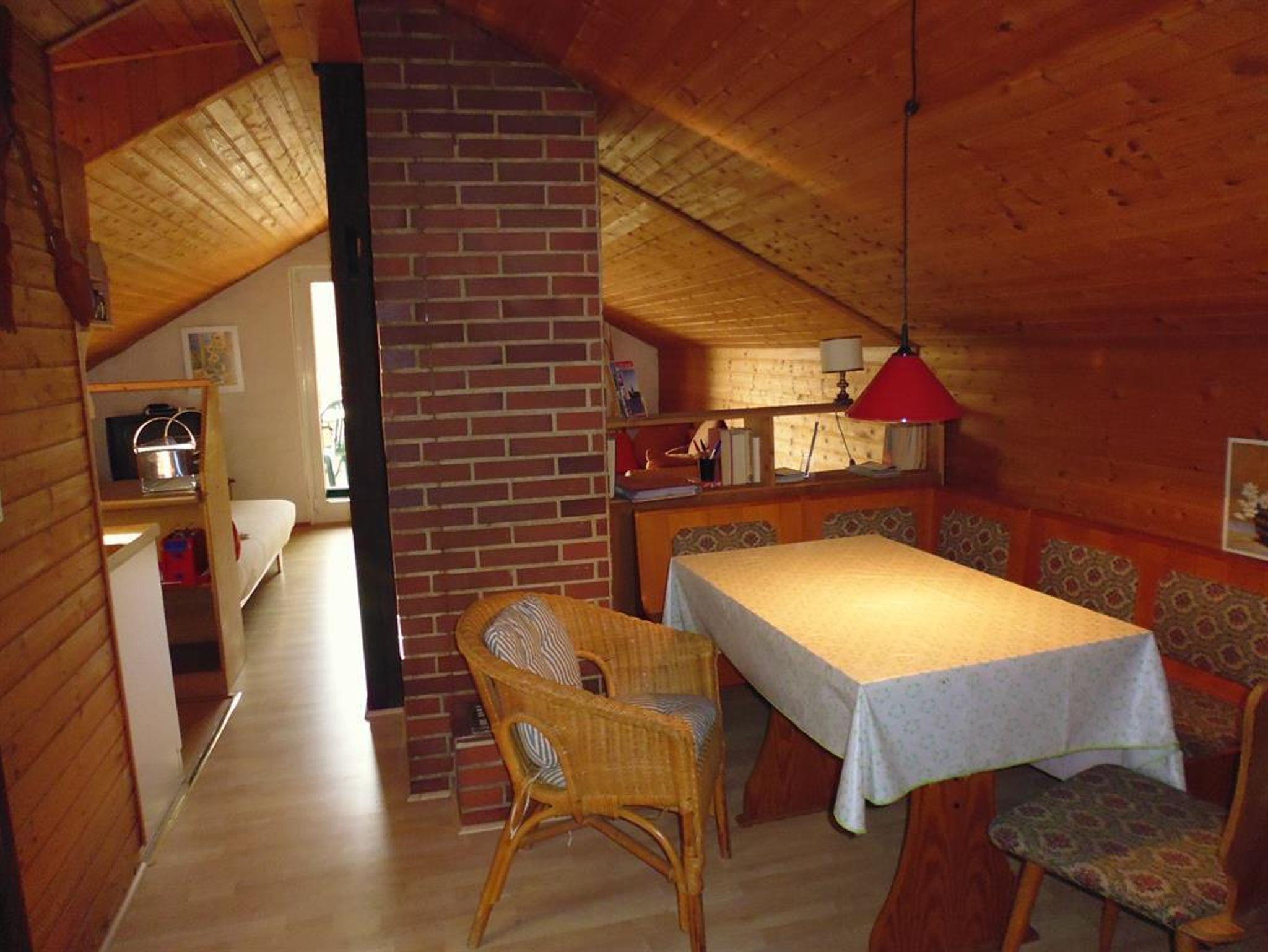 Oben: Appartement mit kleiner Küchenzeile, 2 große Schlafcouchen, Duschbad, Eß-und Sitzecke, Balkon nach Südwesten.