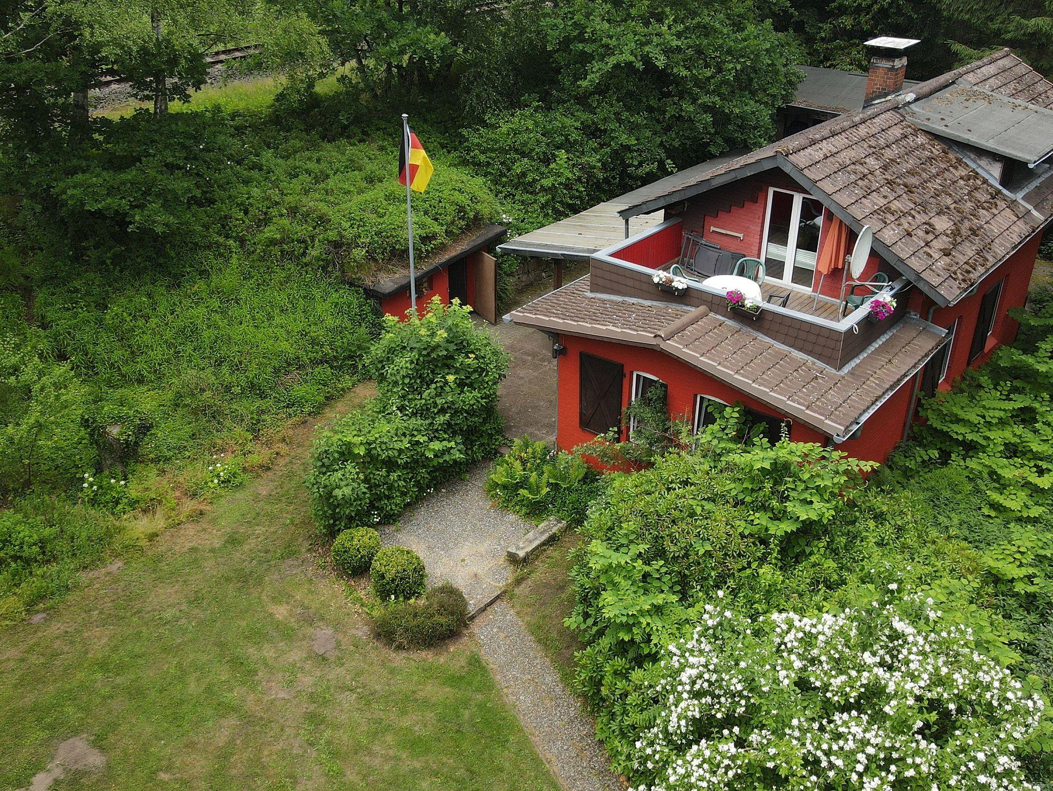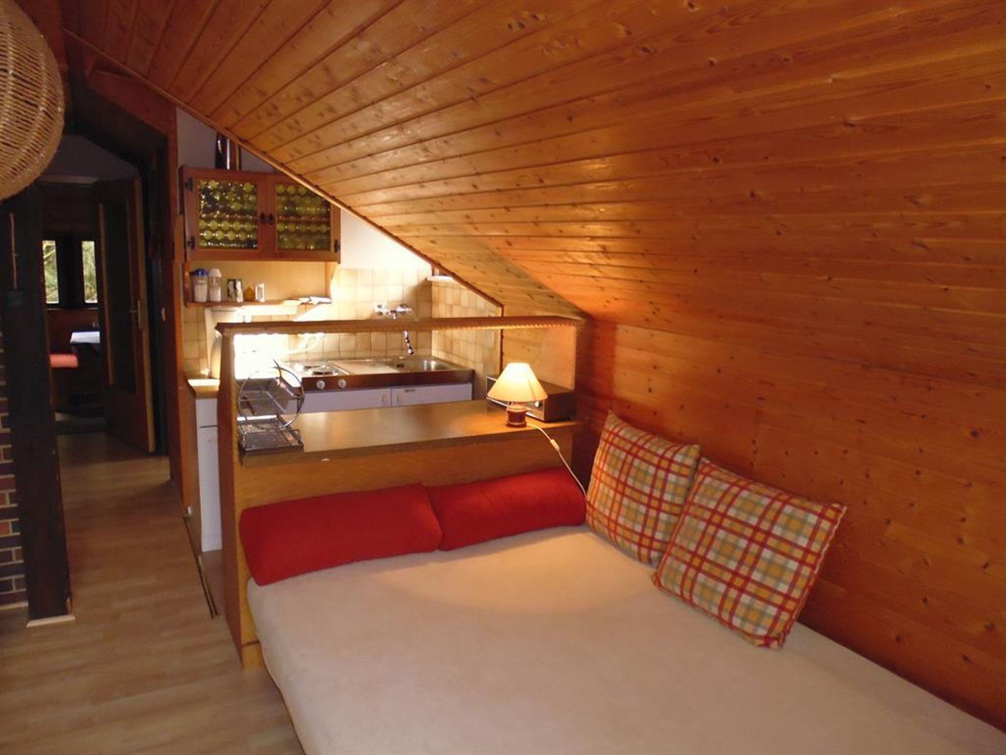 Unten: Fachwerk, Wohnraum in 2 Ebenen, 2 Kaminöfen, 1 Schlafzimmer mit Ehebetten und ein Hoch- bzw. Etagenbett, Küchenzeile mit Backofenherd und Geschirrspüler im Eingangsbereich, Duschbad, überdachte Terrasse und Grill.