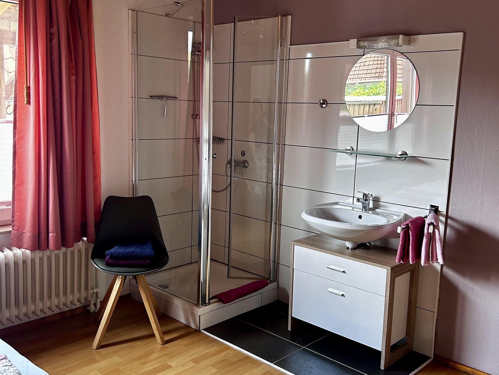 1. Schlafzimmer im Erdgeschoss mit Dusche und Waschbecken. 1 WC.