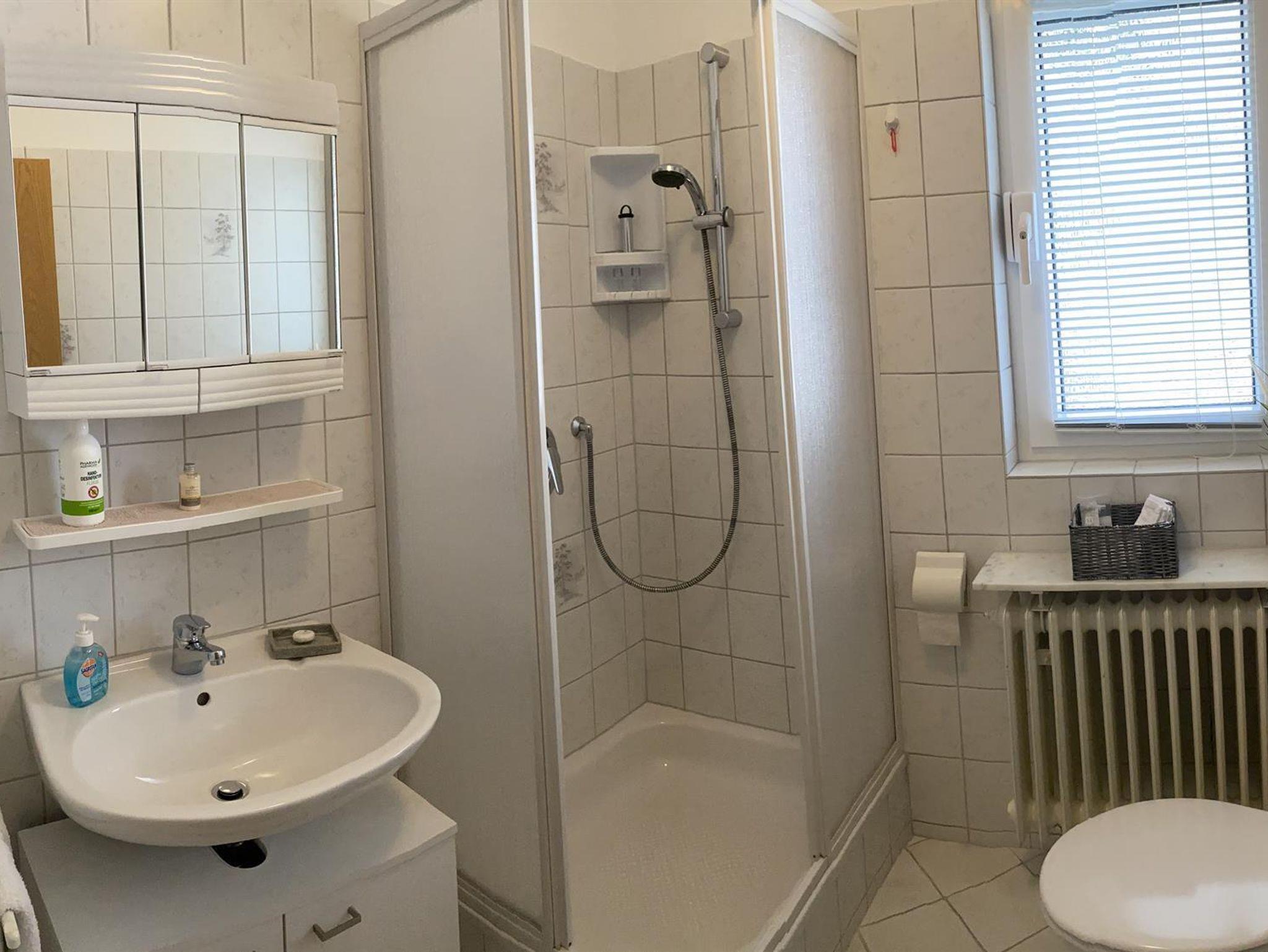 Dusche/WC mit Fenster, Handbrause; Waschtisch mit Spiegelschrank, Kosmetikspiegel, Fön;