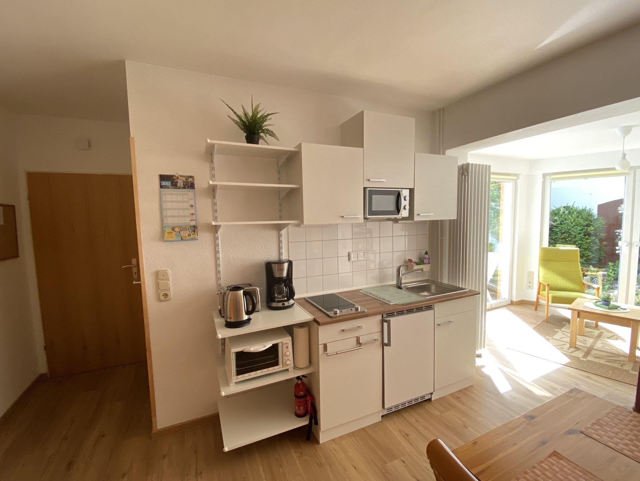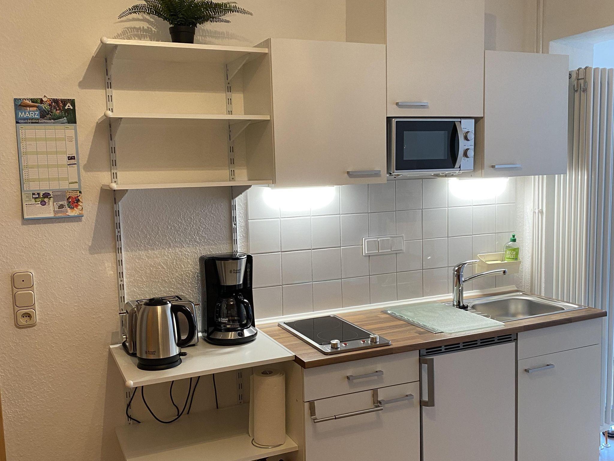 Küchenzeile mit Kühlschrank (inkl. Gefrierfach), Spüle, Ceran-Zweiplattenherd, Mikrowelle, Toaster, Kaffeemaschine und Kaffeefiltern, Gewürze, Eierkocher, Geschirr, Wasserkocher, Besteck, Töpfe, Pfanne etc. sowie div. weiteres Kücheninventar;