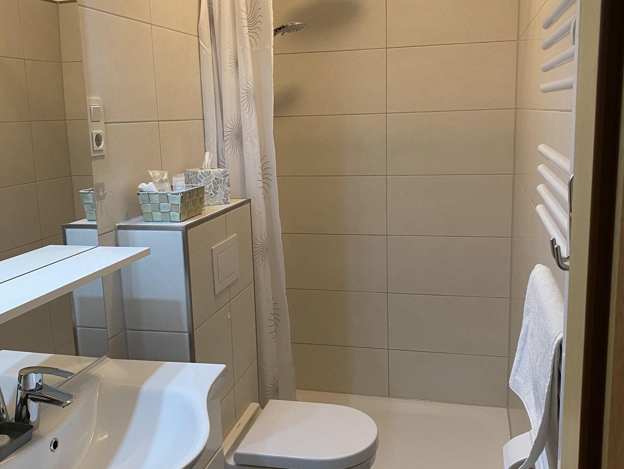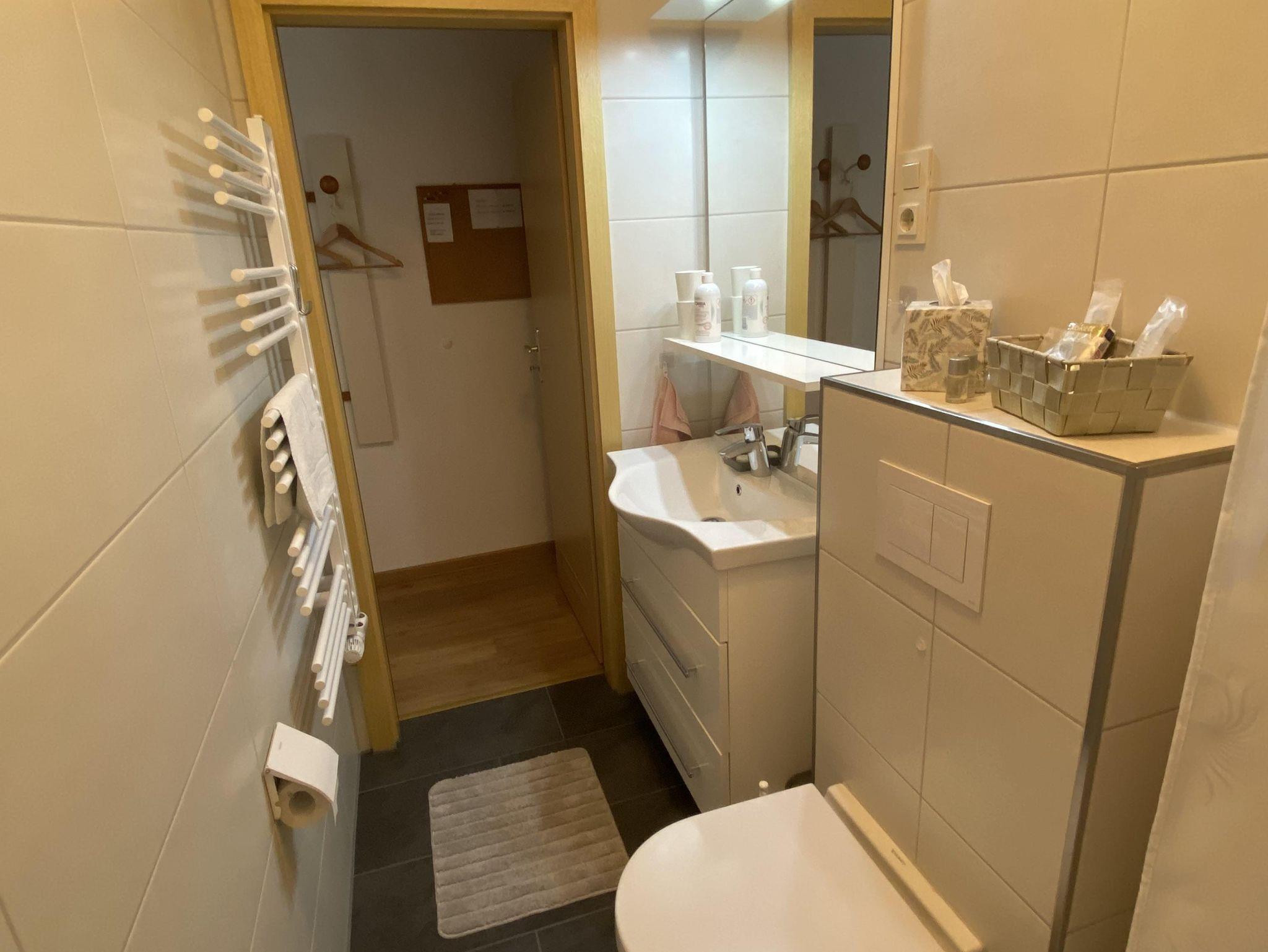 Dusche/WC mit großer Dusche/Regendusche und zusätzlicher Handbrause, Waschtisch mit großem LED-Spiegel; Kosmetikspiegel und Fön;