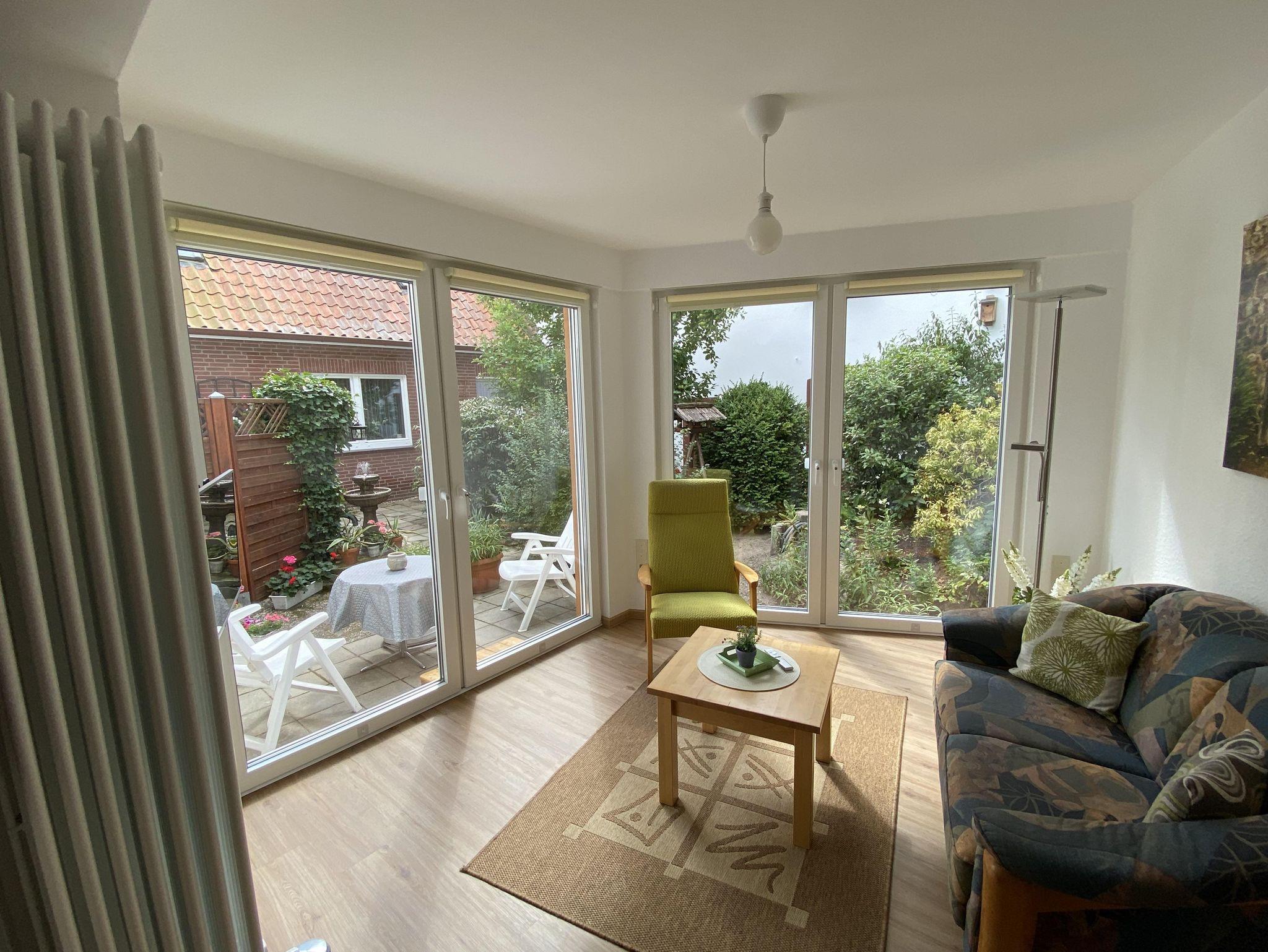 Wohnbereich mit Sofa, zusätzlich Fußbodenheizung im Wohnbereich; Flachbild- SAT- TV, WLAN kostenlos;