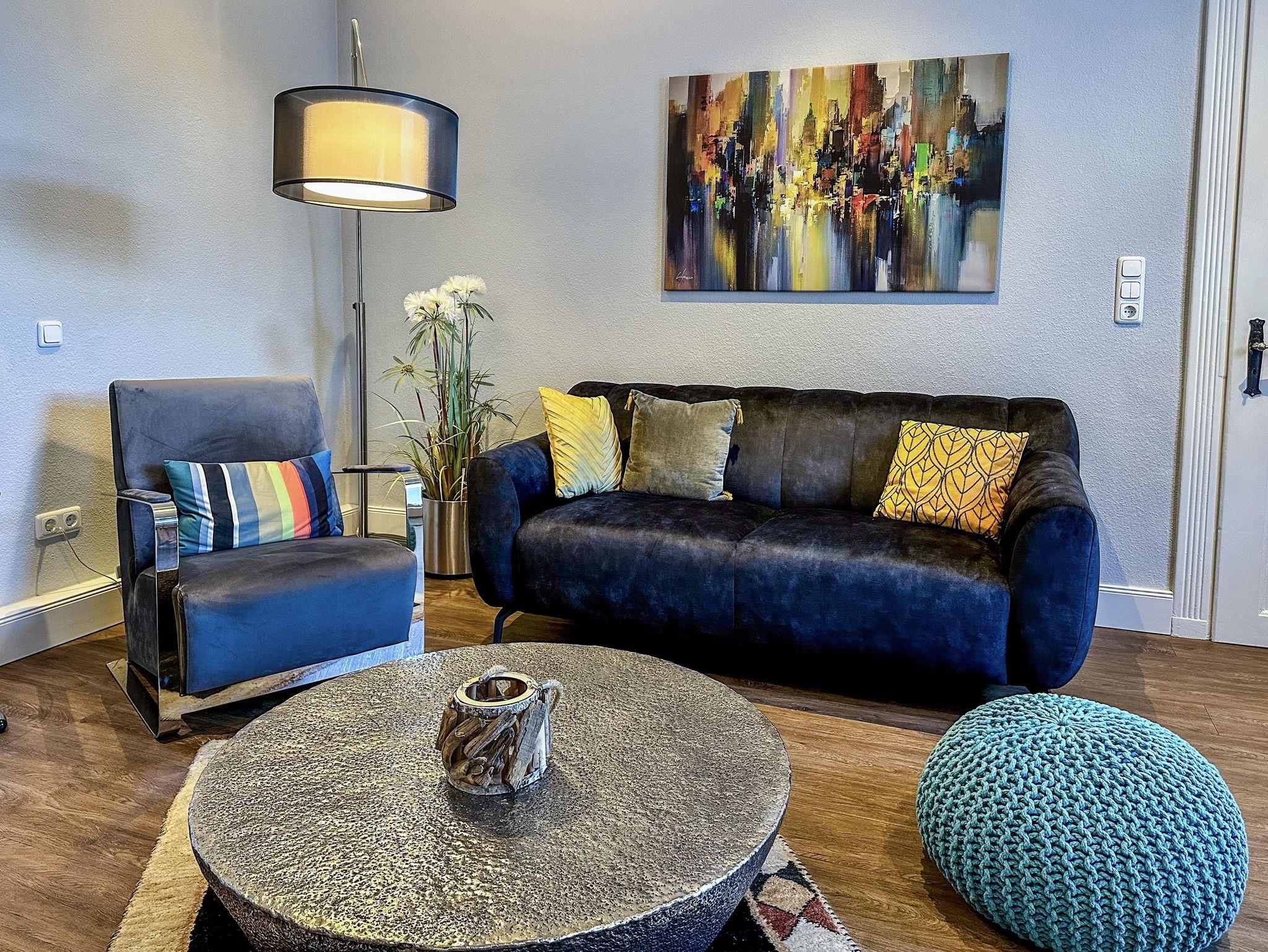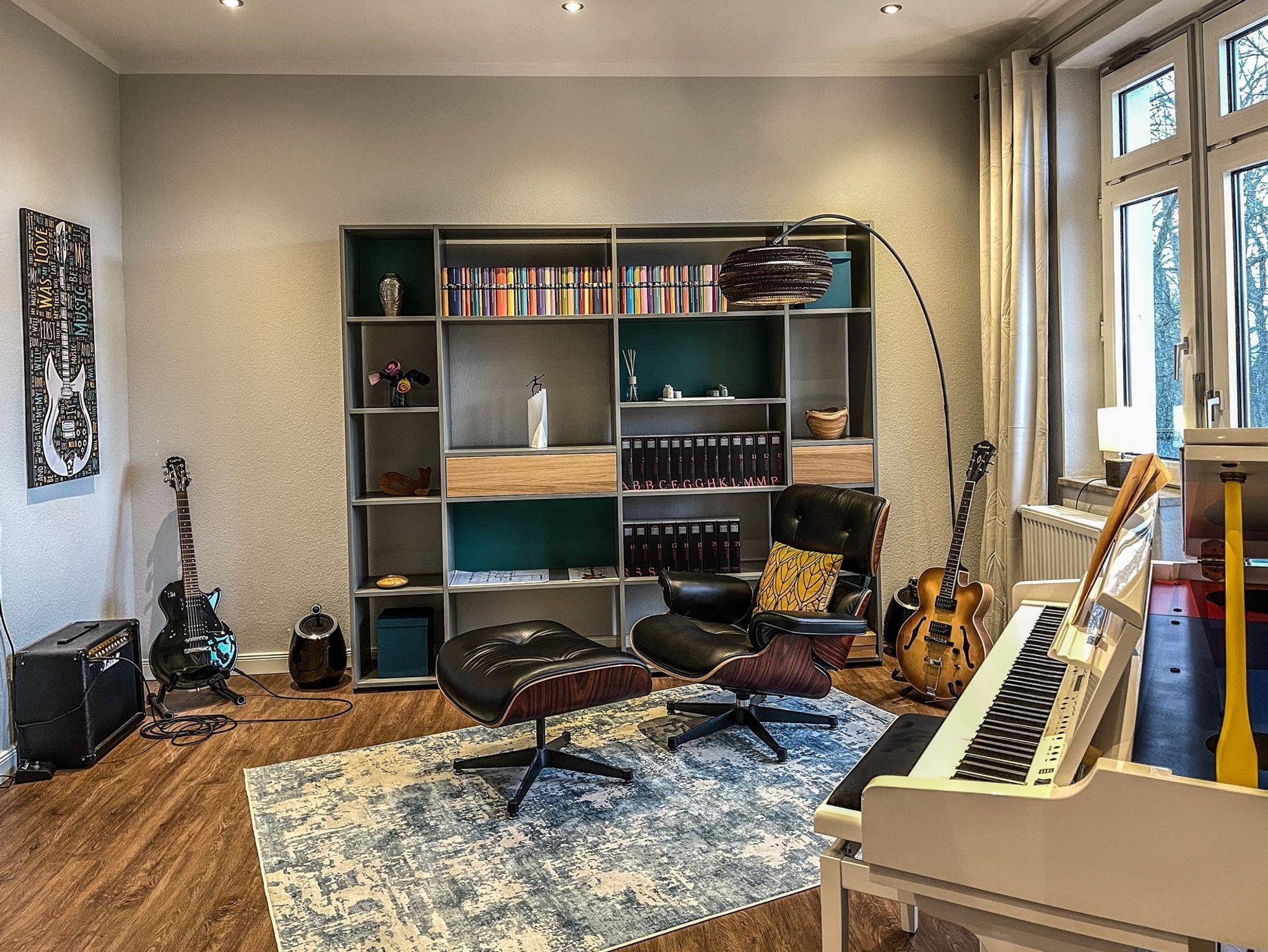 die EINS: Die Große mit dem etwas Mehr. 5 Zi., 122 qm für 1-4, Boxspringbett, Wasserbett (Gel), 2 Bäder mit Walk-in Dusche od. Badewanne. Bibliothek-Musikzi., Terrasse, Balkon zum Park