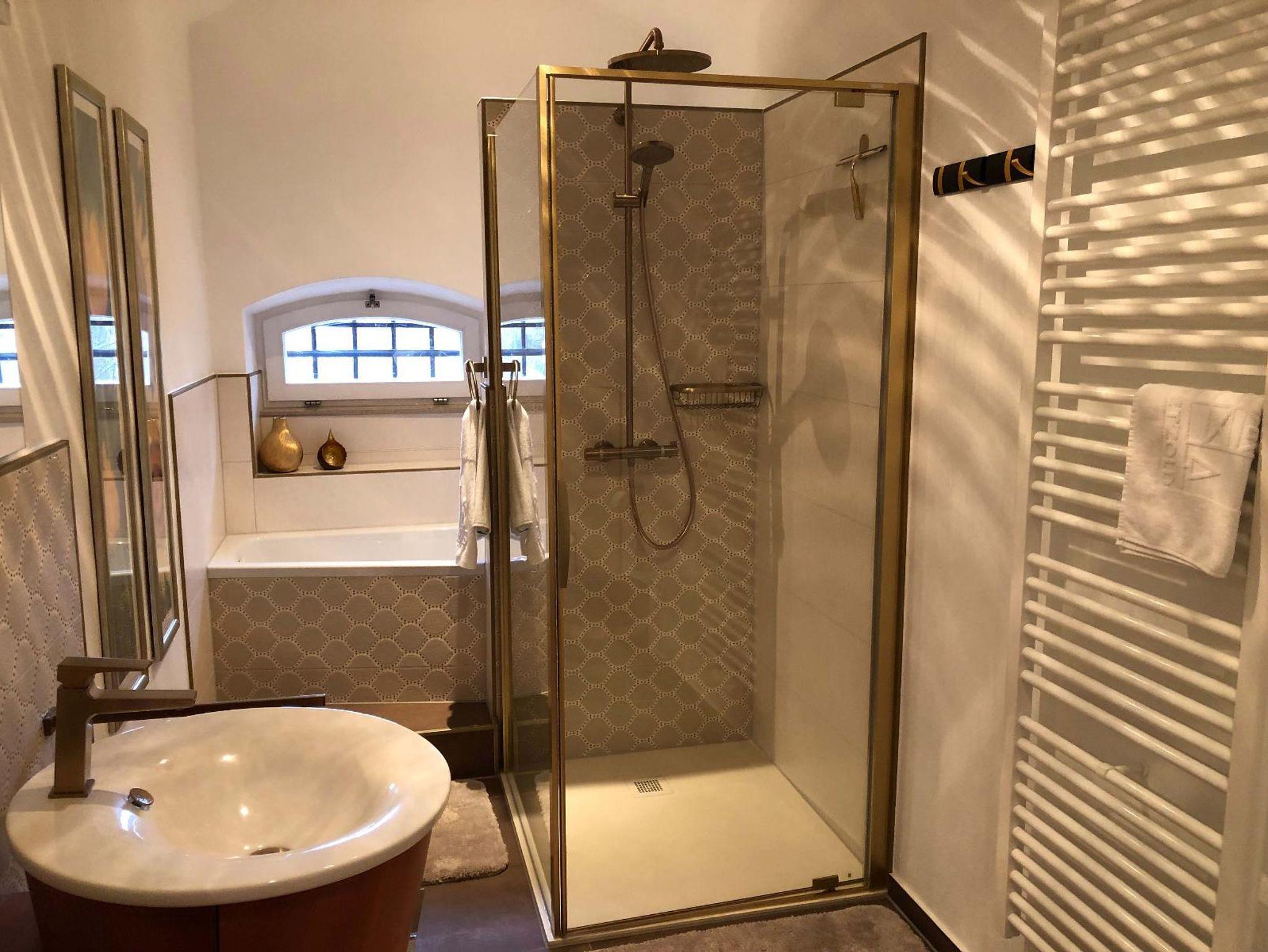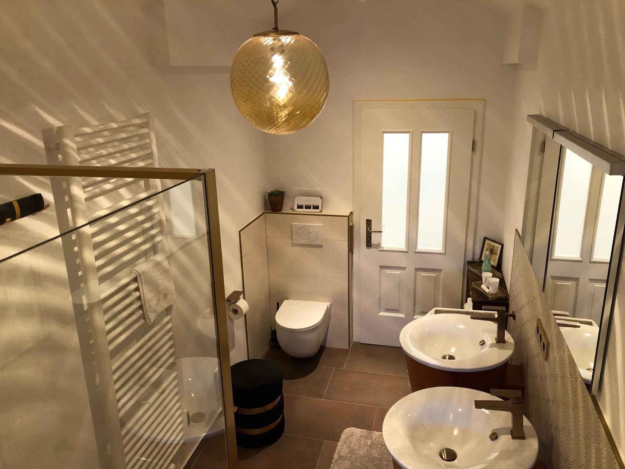 Das Badezimmer ist mit einer Badewanne und einer großen, bodengleichen Dusche frisch renoviert. Unter den beiden Waschtischen können Sie Ihre Kosmetikartikel verstauen.