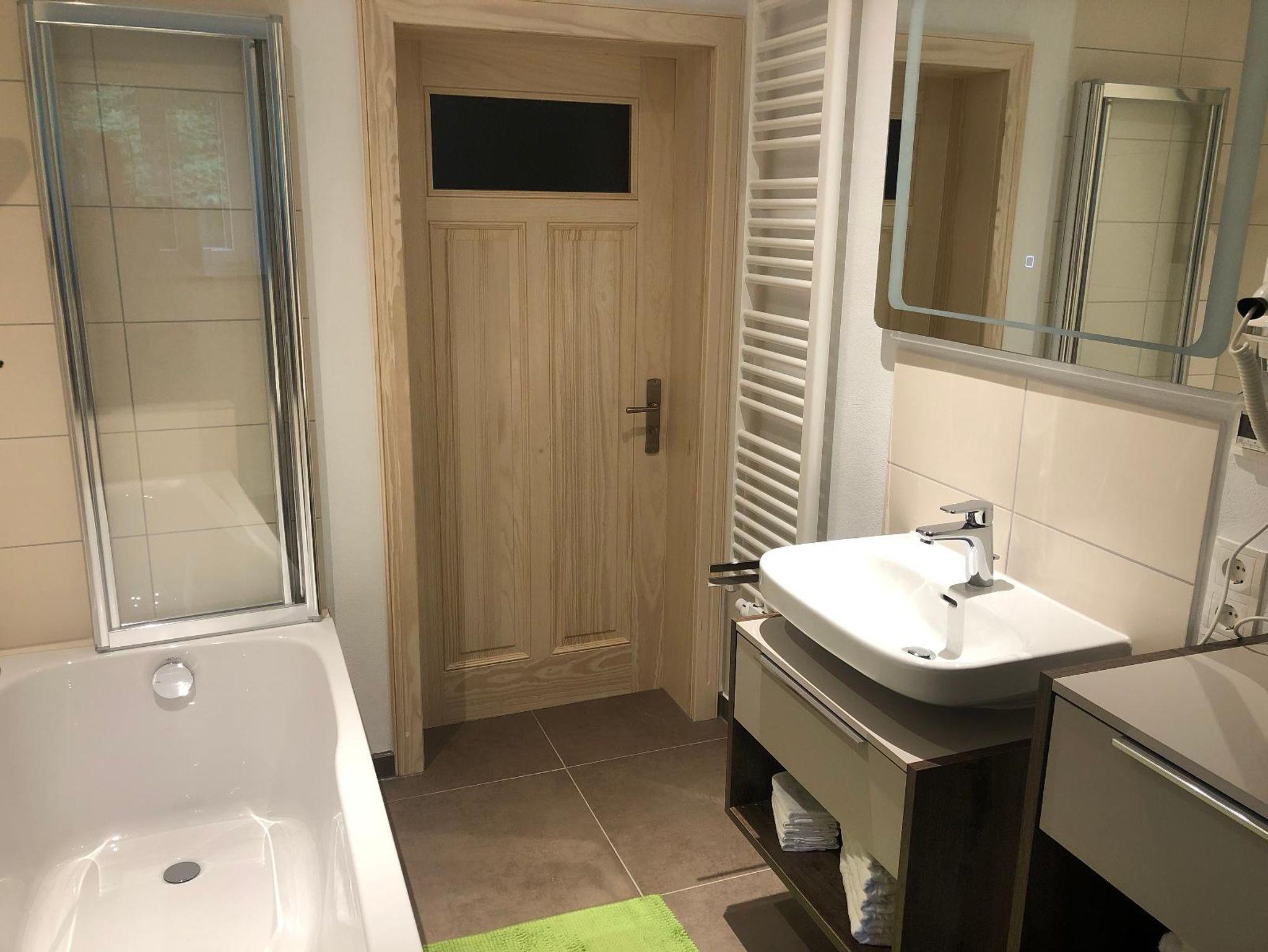 Im Badezimmer wartet eine Badewanne mit Duschkabine auf Sie. Falls nötig, können Sie auch das Duschbad in Ihrem Stockwerk (das zum Saunabereich gehört) verwenden – hier ist eine bodengleiche, große Dusche untergebracht.