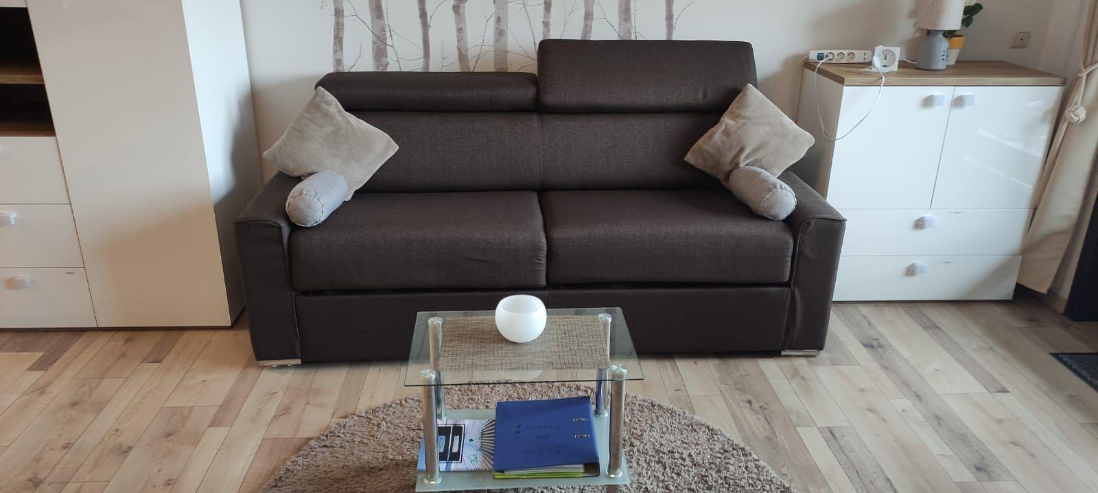 Das 35 qm große, sonnige Ein-Raum-Appartment verfügt über ein gemütliches Wohnzimmer mit integrierter Einbauküche mit Geschirrspüler (großzügig und komplett ausgestattet). Im Wohnzimmer befindet sich eine Couch, die als bequemes Doppelbett mit Lattenrost und Matratze umfunktioniert werden kann. Außerdem ist ein komfortables Wandklappbett vorhanden. Ein modernes Duschbad gehört zur Wohnung. Die Ein-Raum-Wohnung wurde renoviert und modernisiert.