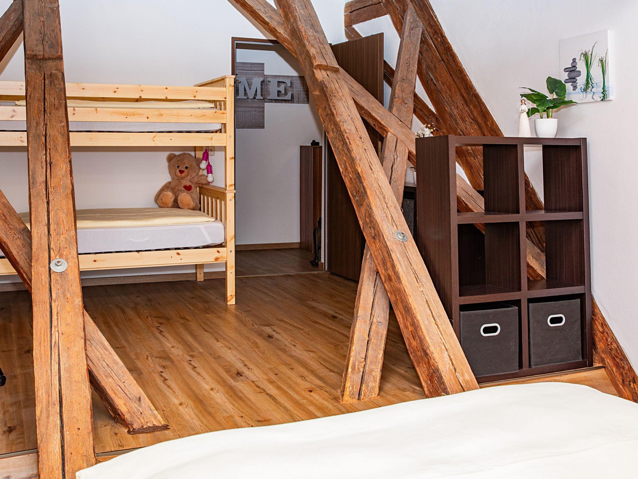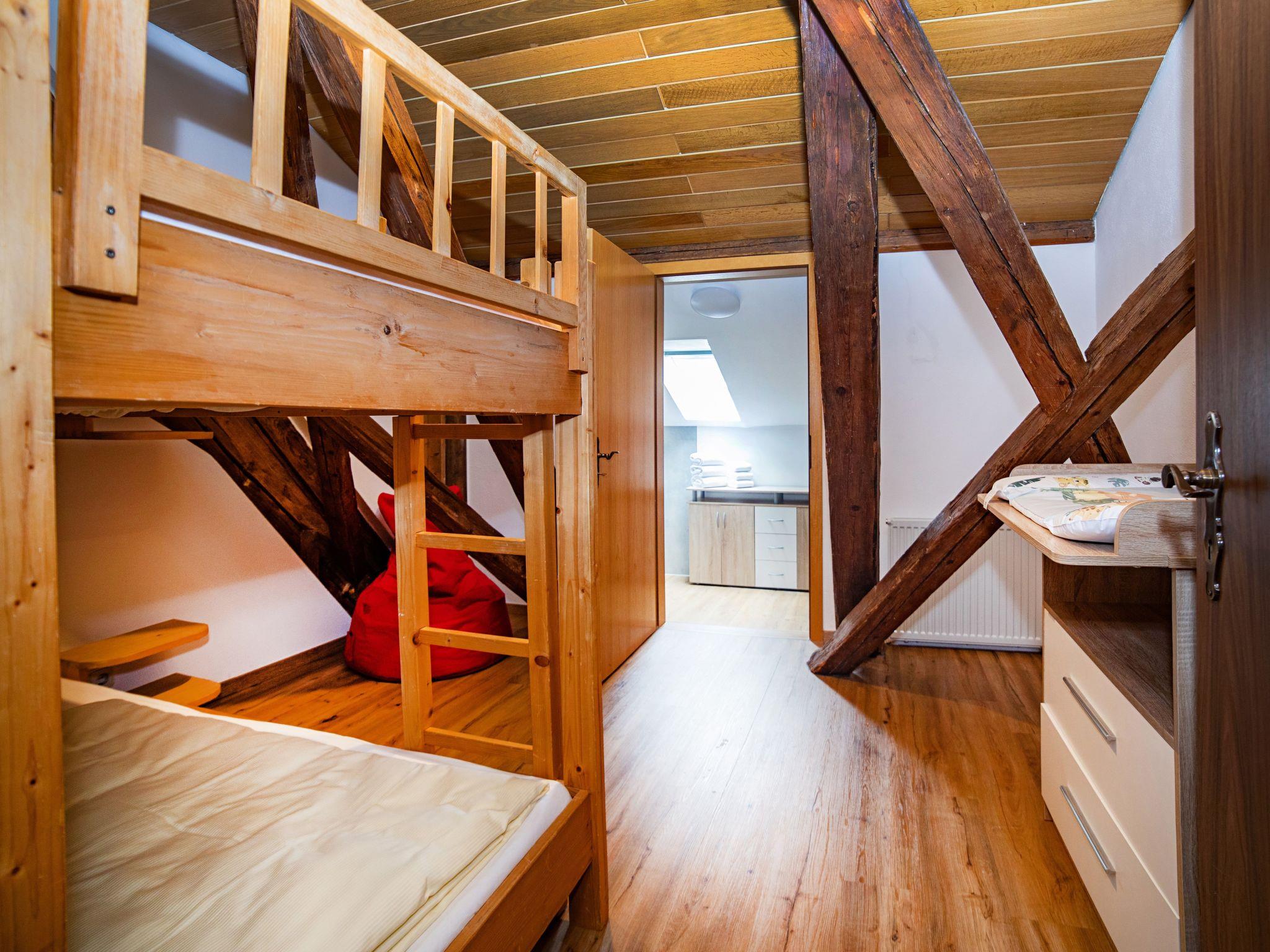 Type B-Studio 75 sqm, 1 bedroom with double bed and bunk bed, 1 children's room with bunk bed and changing table, cosy eat-in kitchen with large kitchenette, dining area, living area, bath/shower/WC, balcony on the 2nd floor with access to the sun terrace on the 1st floor with seating and deckchairs as well as barbecue facilities.