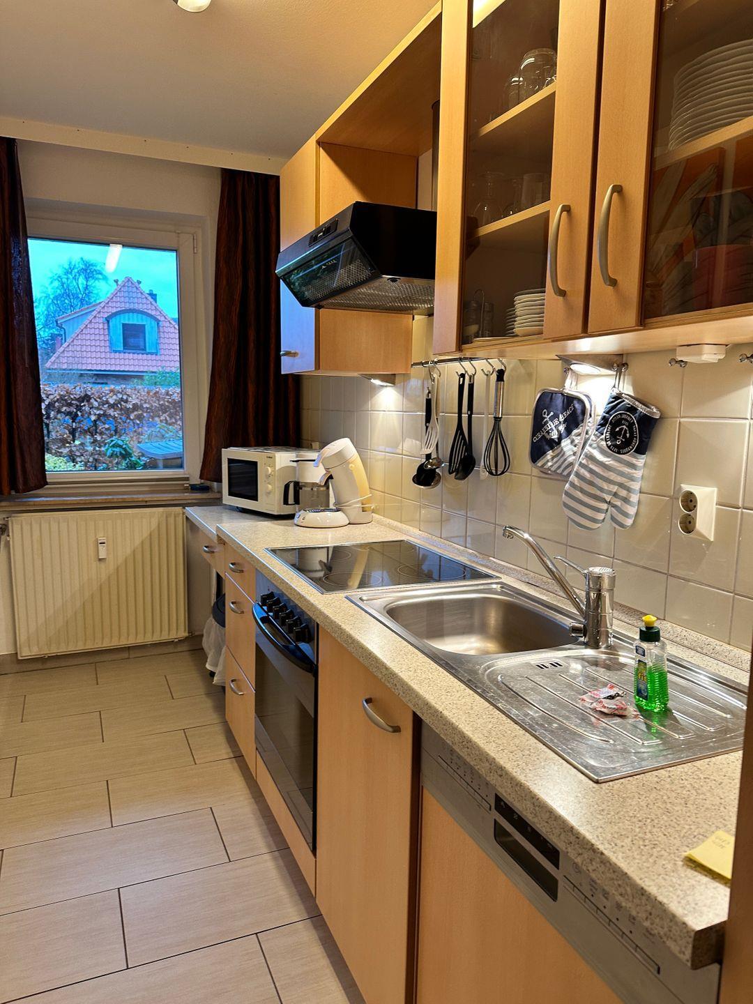 Die am Wohnzimmer angrenzende separate Einbauküche hat ein 4er-Cerankochfeld mit Backofen, Mikrowelle, Wasserkocher, Kaffeemaschine, Toaster, Kühlschrank ohne Tiefkühlfach & Geschirrspülmaschine ausgestattet. Selbstverständlich sind ausreichend Geschirr sowie die üblichen Utensilien einer Küche vorhanden.