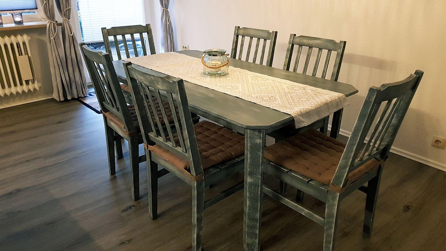 Des weiteren gibt es einen sehr großen Esstisch, dieser bietet Platz für bis zu 6 Personen um daran gemütlich zu essen oder um einen grandiosen Spieleabend zu verleben.