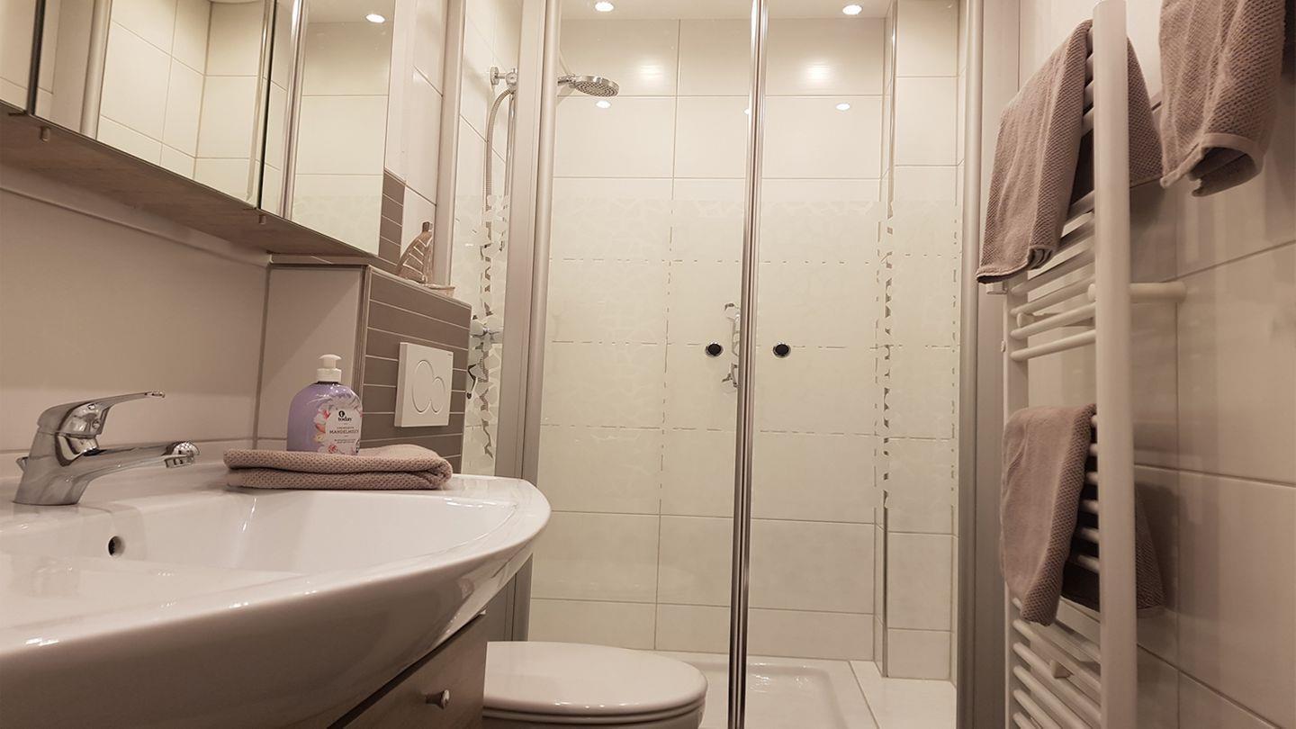Das Duschbad mit bodengleichem Einstieg verfügt über ausreichend Ablageflächen und wurde 2022 renoviert.