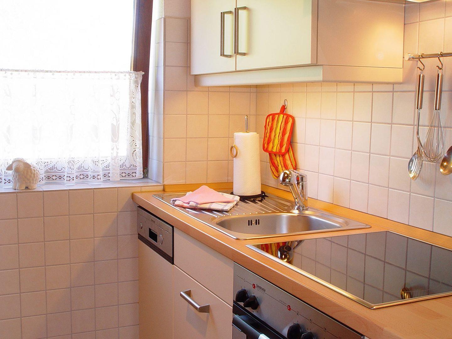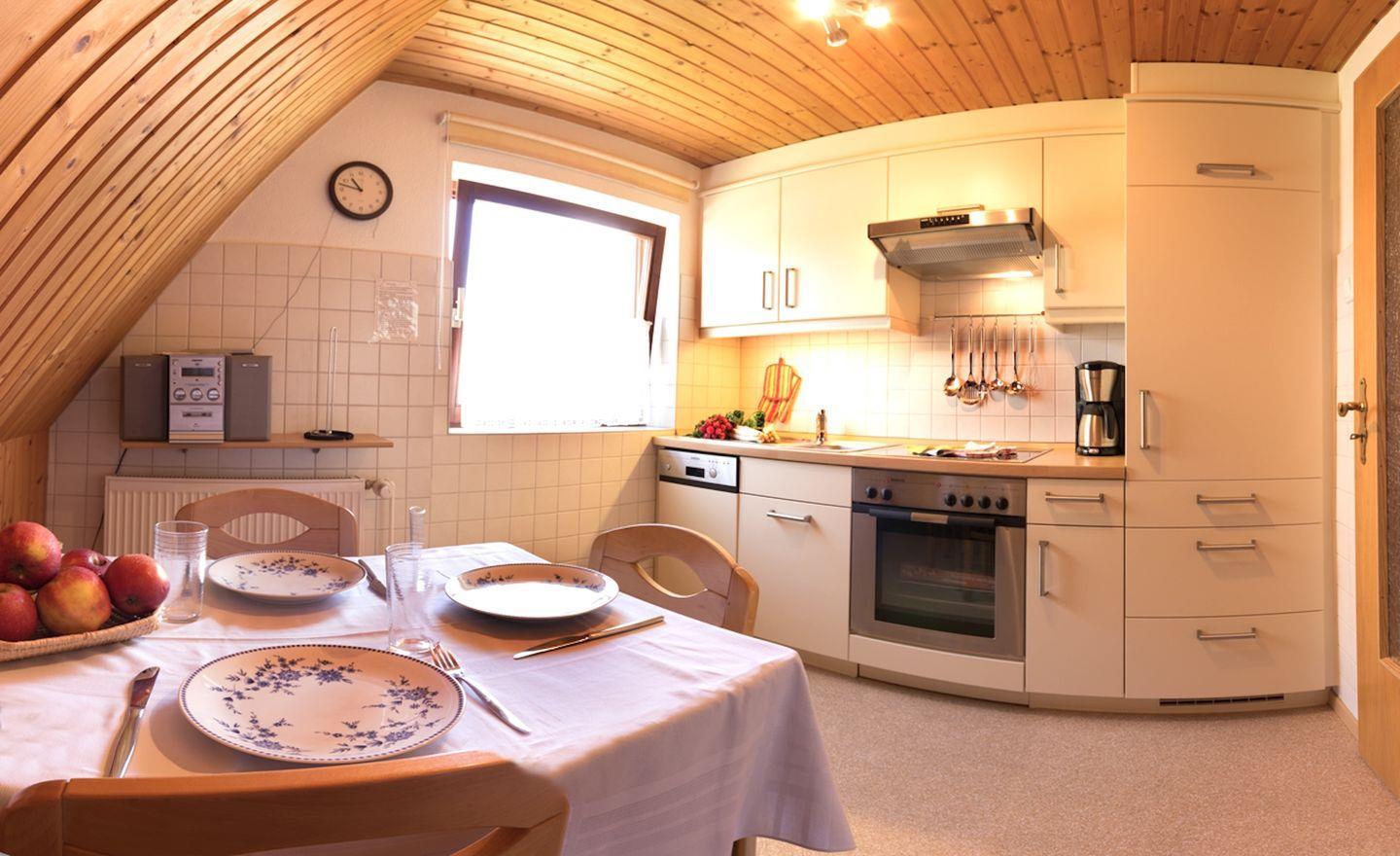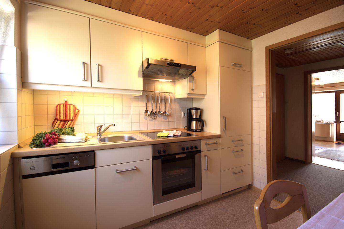 Der Wohnbereich ist dank Laminatboden hell und freundlich gestaltet. Eine gemütliche Sofaecke mit Sessel, Sat-TV (digital) und Radio lädt zum Entspannen ein. Bücher und Spiele stehen für unterhaltsame Stunden bereit – ideal bei wechselhaftem Wetter. Die geschlossene Küche ist vollständig ausgestattet: Hier finden Sie Ceranherd, Backofen (Elektroanschluss), Spülmaschine, Kühlschrank mit Gefrierfach, Kaffeemaschine, Toaster, Wasserkocher, Mixer sowie zahlreiche Küchenutensilien, Geschirr und Besteck. Ein Esstisch in der Küche bietet Platz für gemeinsame Mahlzeiten. Geschirrhandtücher sind vorhanden.