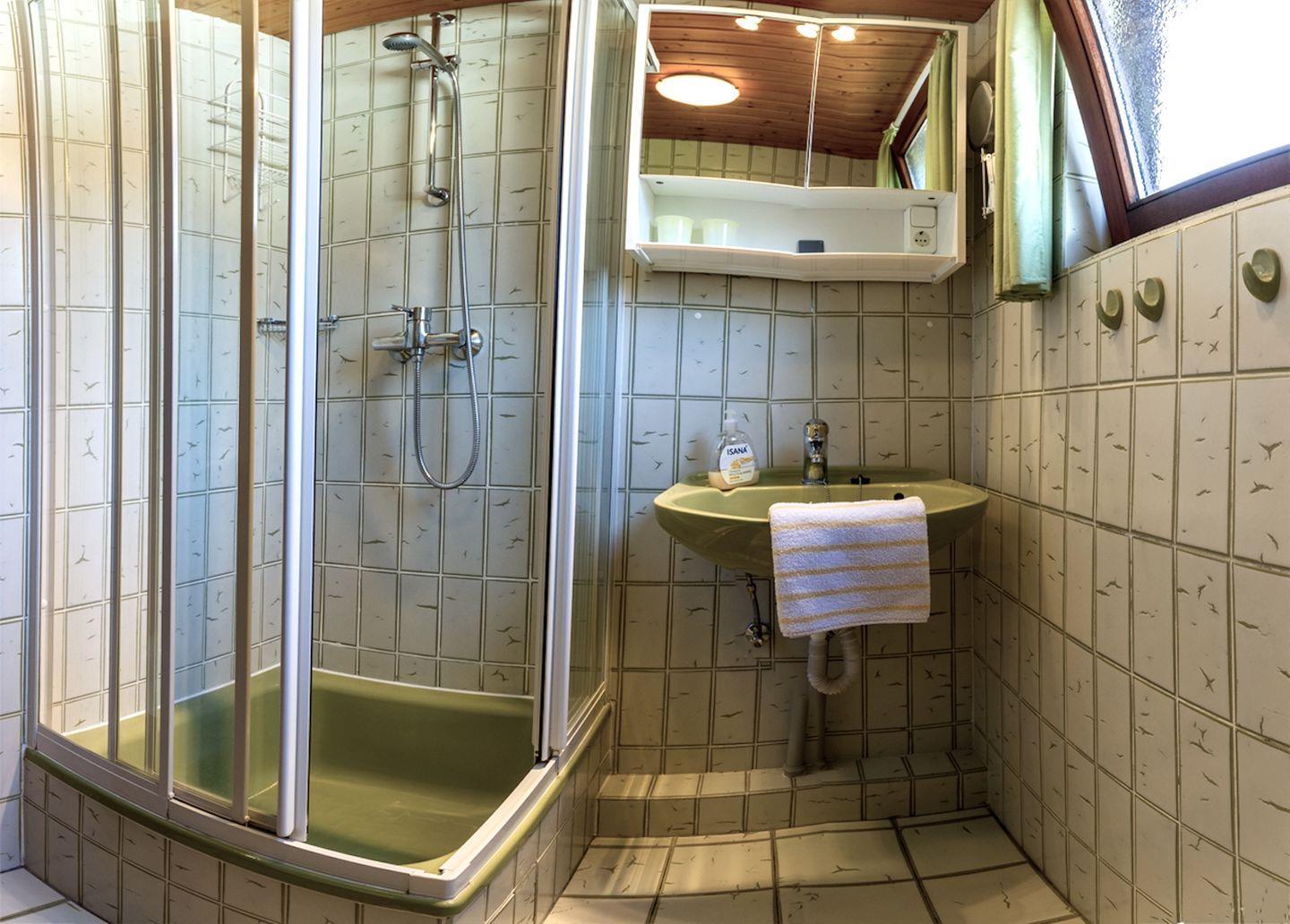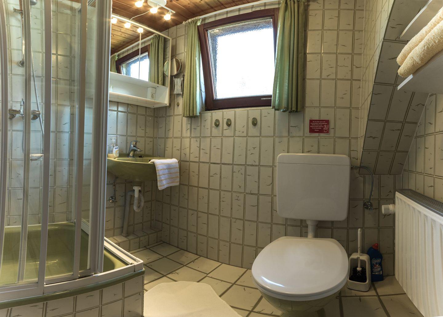 Das Badezimmer ist mit einer Dusche mit Wanne, Waschbecken, WC, Spiegel und beleuchtetem Kosmetikspiegel komfortabel ausgestattet. Ein Haartrockner gehört zur Grundausstattung. Für Sicherheit sorgen Rauchmelder und ein Verbandskasten.
