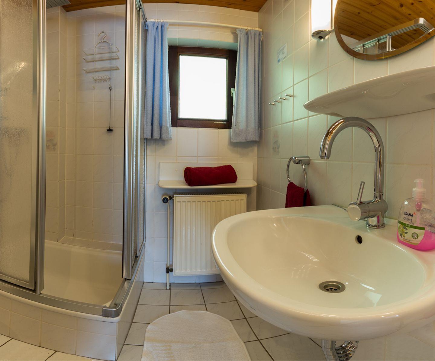 Das Tageslicht Duschbad verfügt über ausreichend Ablageflächen und ein Fenster mit Insektenschutzgitter zum Lüften.