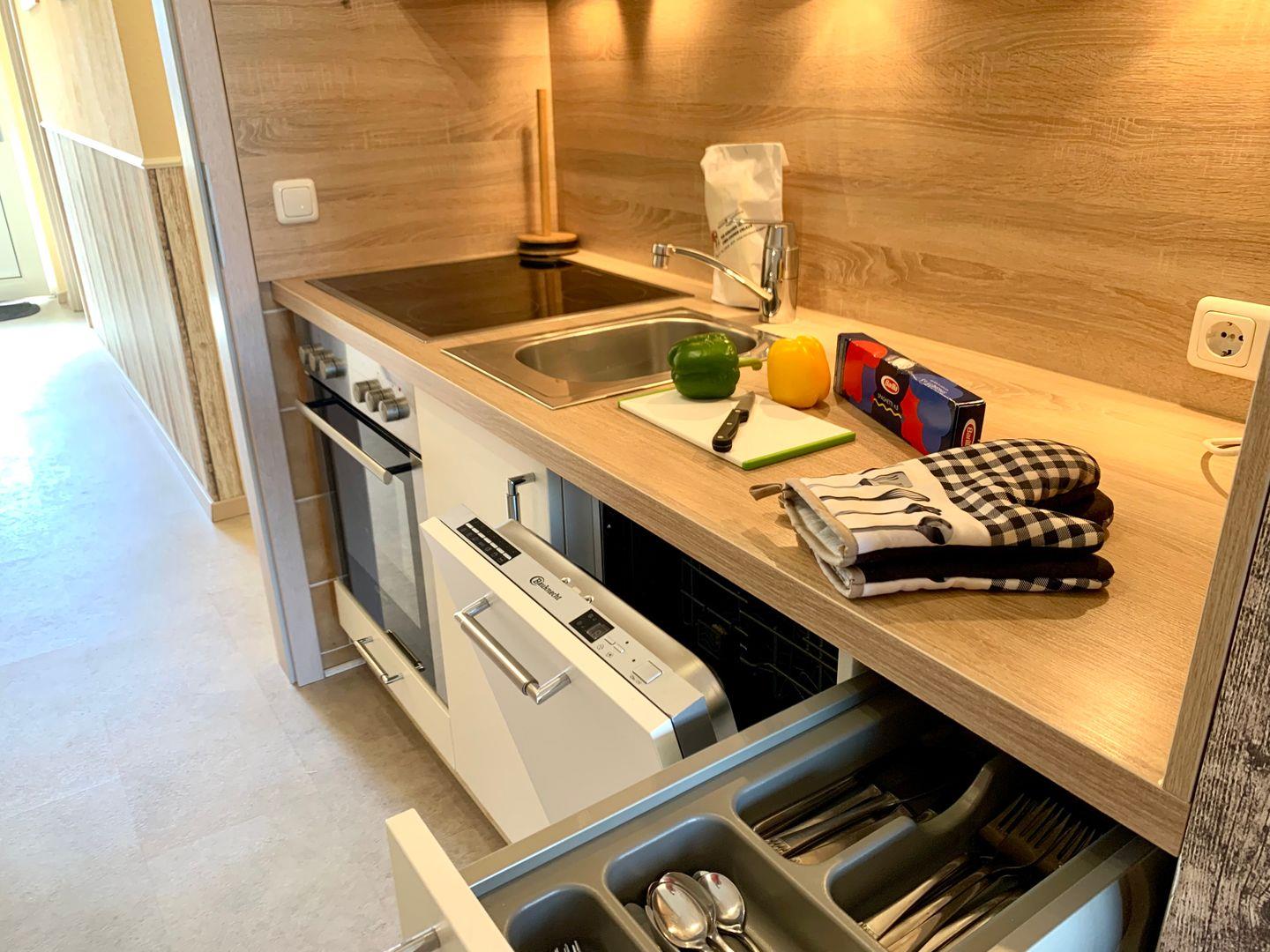 Die offene, sehr moderne Küchenzeile verfügt unter anderem über einen Backofen, ein großer Kühlschrank mit Gefrierfach sowie Kaffeemaschine und Geschirrspüler.
