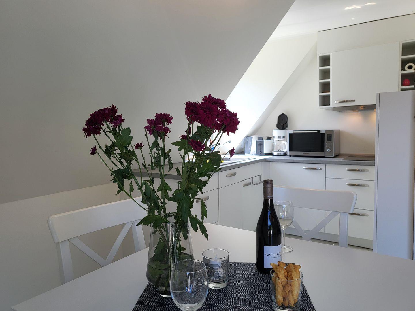 Die angrenzende, offene Küche ist sehr gut ausgestattet, unter anderem gehören dort Cerankochfeld und Backofen, Kühlschrank mit Gefrierfach sowie Geschirrspüler und Kaffeemaschine zum Inventar.