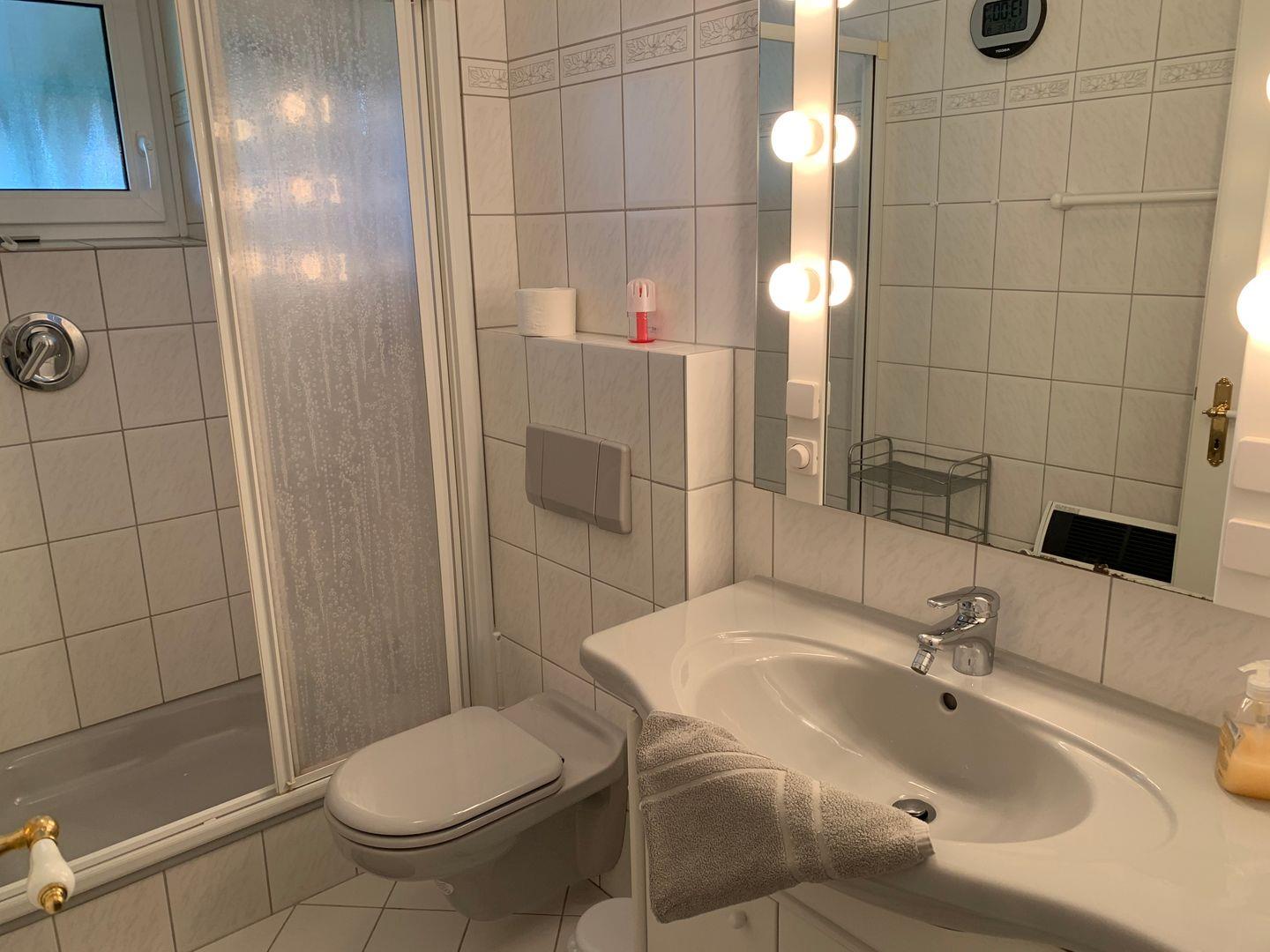 Im Flur steht ein Einzelschrankbett, zur Ferienwohnung gehört ein Duschbad mit WC.
