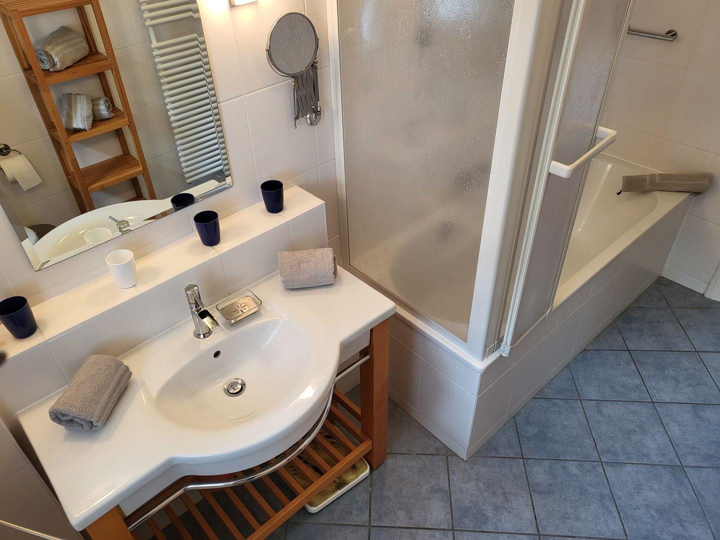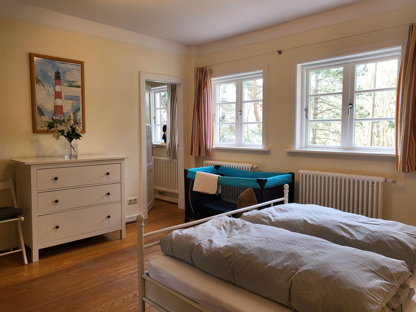 Im 1. OG stehen zwei Schlafzimmer mit jeweils einem Doppelbett (1,60 x 2,00 m), ein Spiel- und Fernsehzimmer sowie ein Vollbad mit WC und ein separates WC zur Verfügung