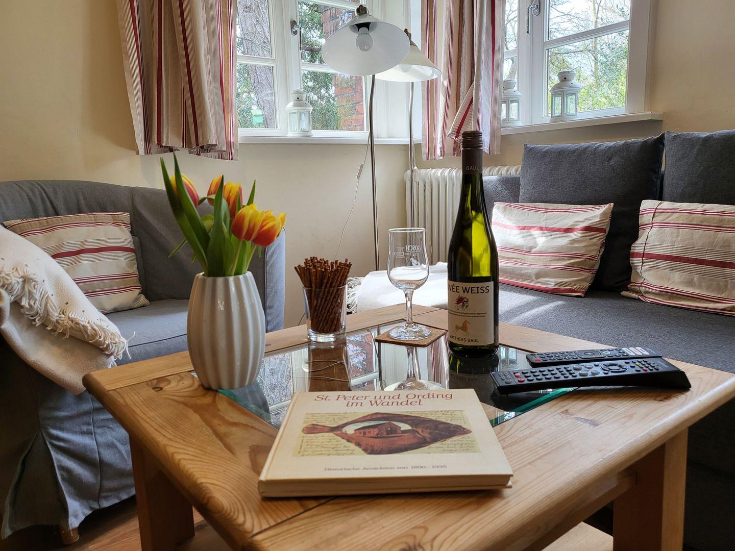 Das Ferienhaus verfügt über ein großes Wohnzimmer mit Kaminofen, in dem eine Sitzecke mit Couch, Sesseln und einem Flachbild-TV für gemütliche Stunden sorgt.