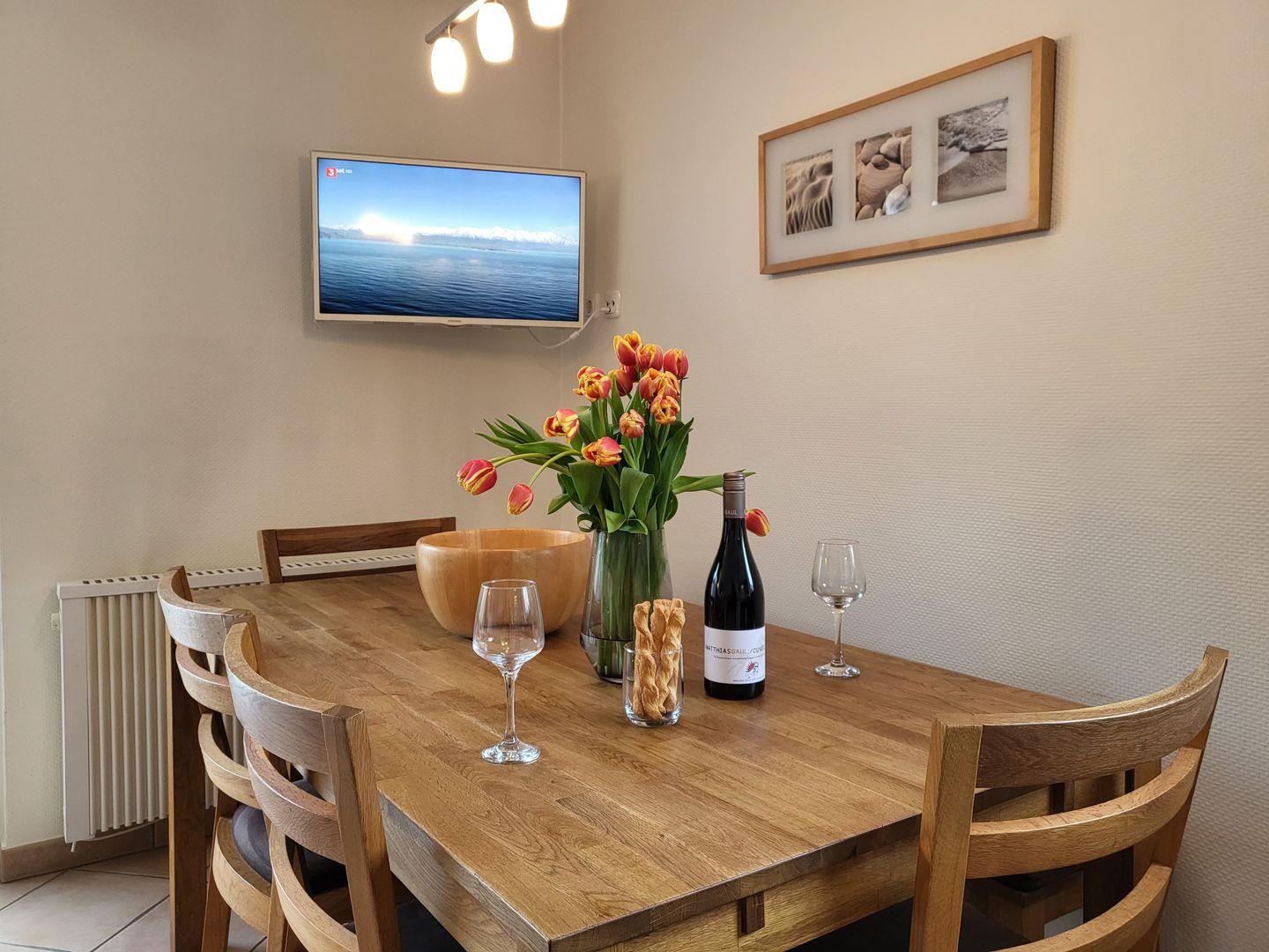 In den Raum integriert liegt die gut ausgestattete Küche des Ferienhauses, hier stehen unter anderem Cerankochfeld und Backofen sowie Kühlschrank mit Gefrierfach, ein Geschirrspüler sowie Kaffeemaschine zur Verfügung.
