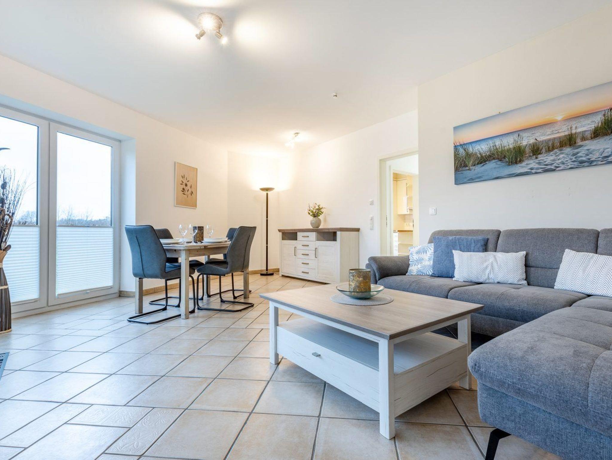 Wohnzimmer mit Ecksofa, SMART-TV (Sat), Esstisch mit vier Stühlen und direktem Zugang zur möblierten Gartenterrasse nach Süden.