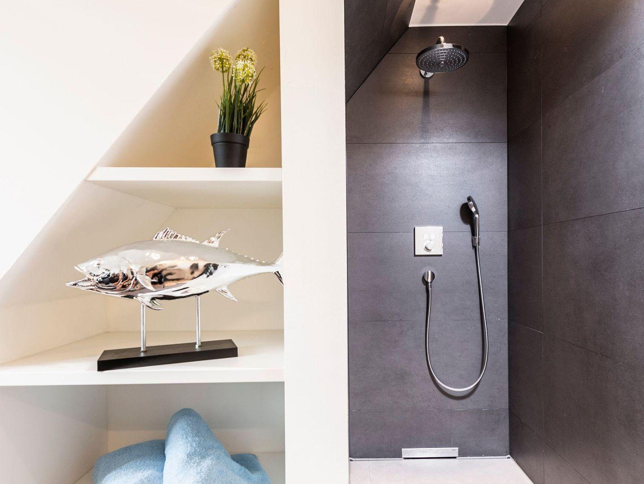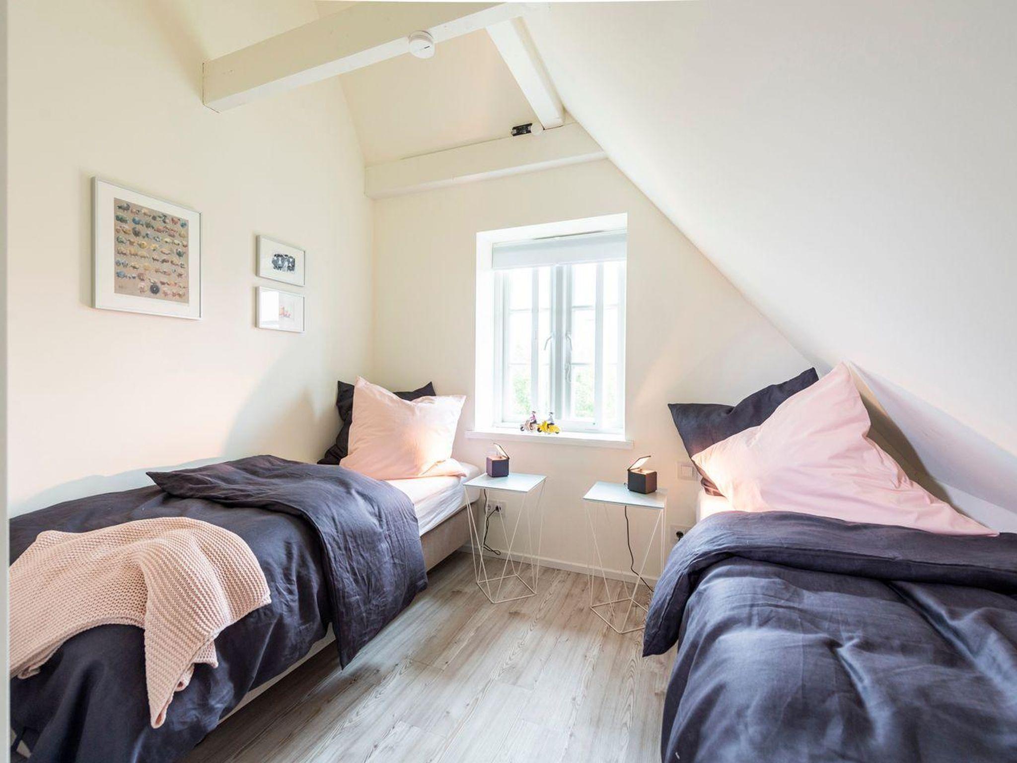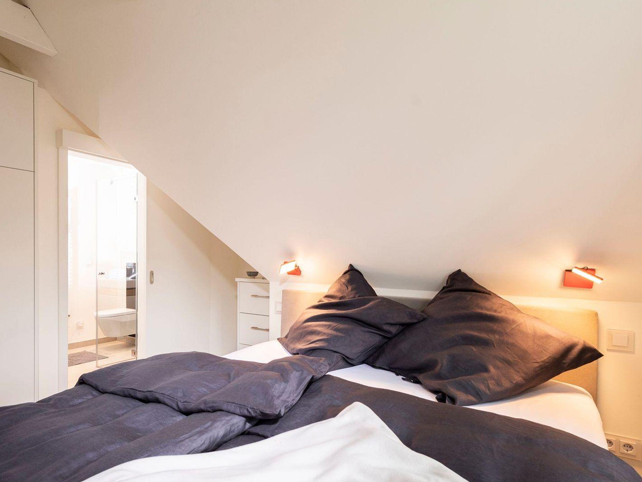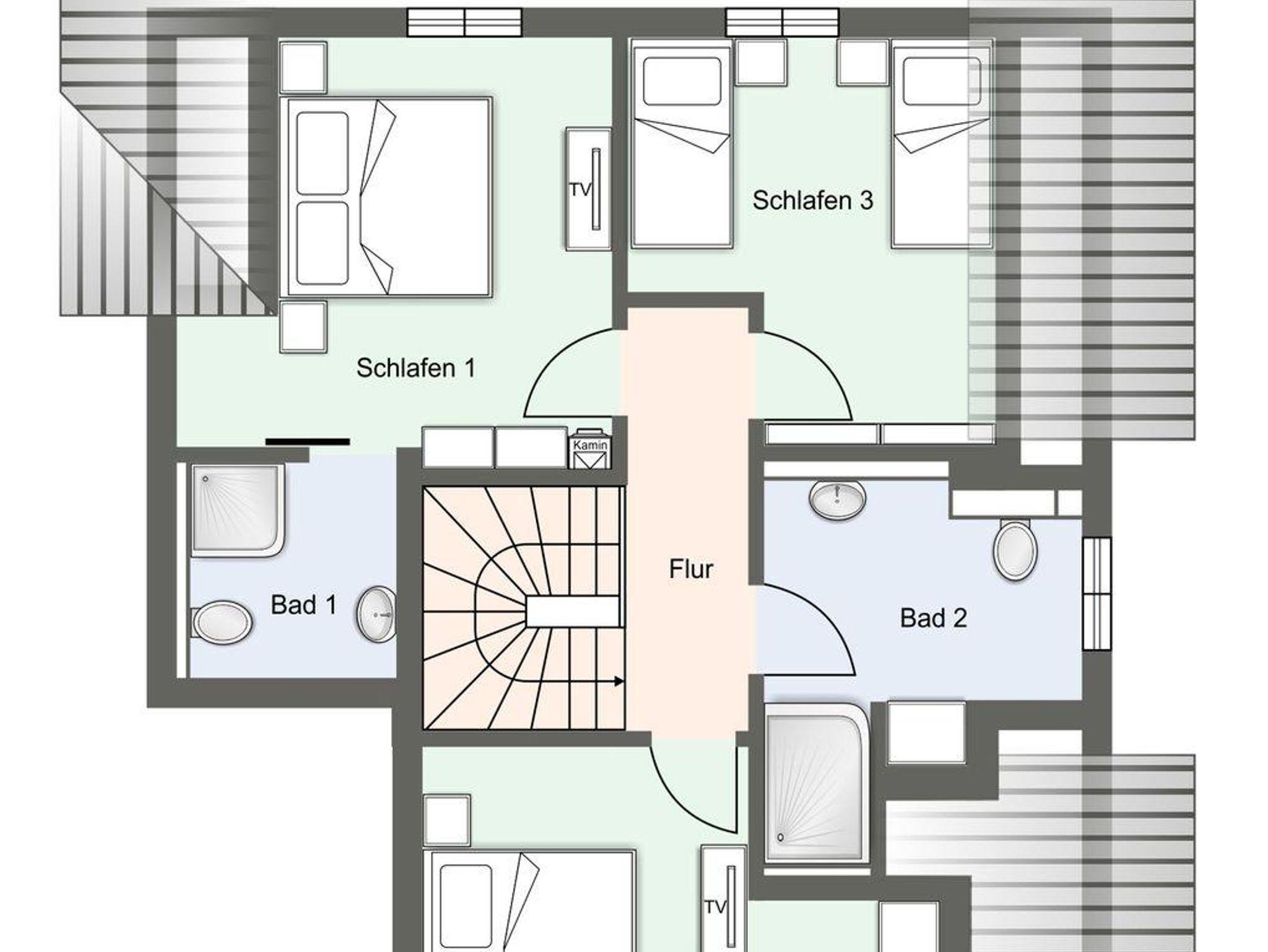 Im Obergeschoss finden Sie ein weiteres Schlafzimmer mit eigenem Duschbad/WC und Boxspringbett (180 x 200 cm), ein Schlafzimmer mit einem weiteren Boxspringbett (180 x 200 cm), ein Schlafzimmer mit 2 Einzelbetten (90 x 200 cm) und ein Badezimmer mit Dusche/WC.