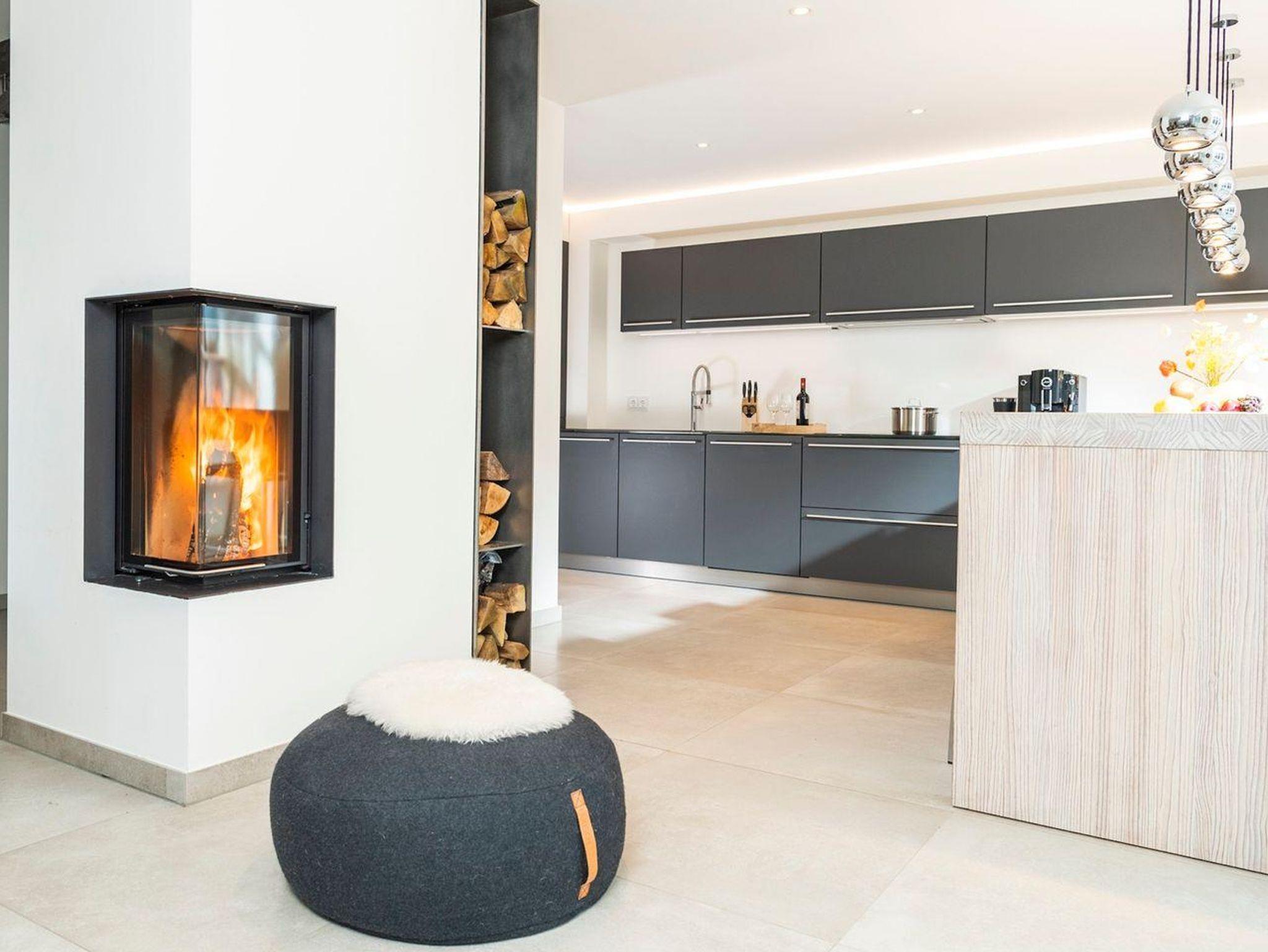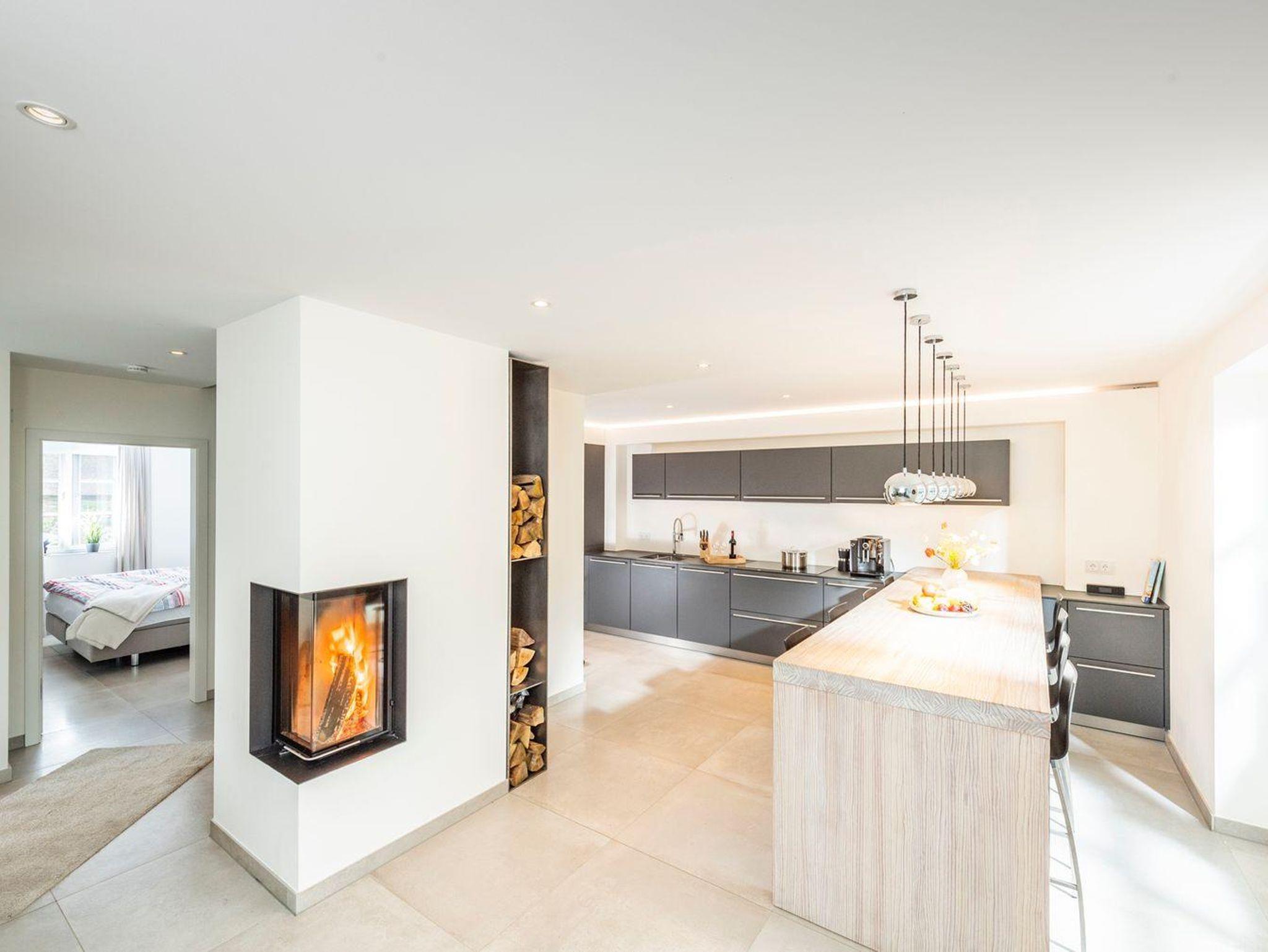 Im Erdgeschoss erwarten Sie ein einladender Flur mit Garderobe, ein geräumiger Wohn- und Essbereich mit offener Küche und Kaminofen, ein Schlafzimmer mit einem komfortablen Boxspringbett (180 x 200 cm) und eigenem Duschbad/WC sowie ein Hauswirtschaftsraum mit Waschmaschine und Trockner.